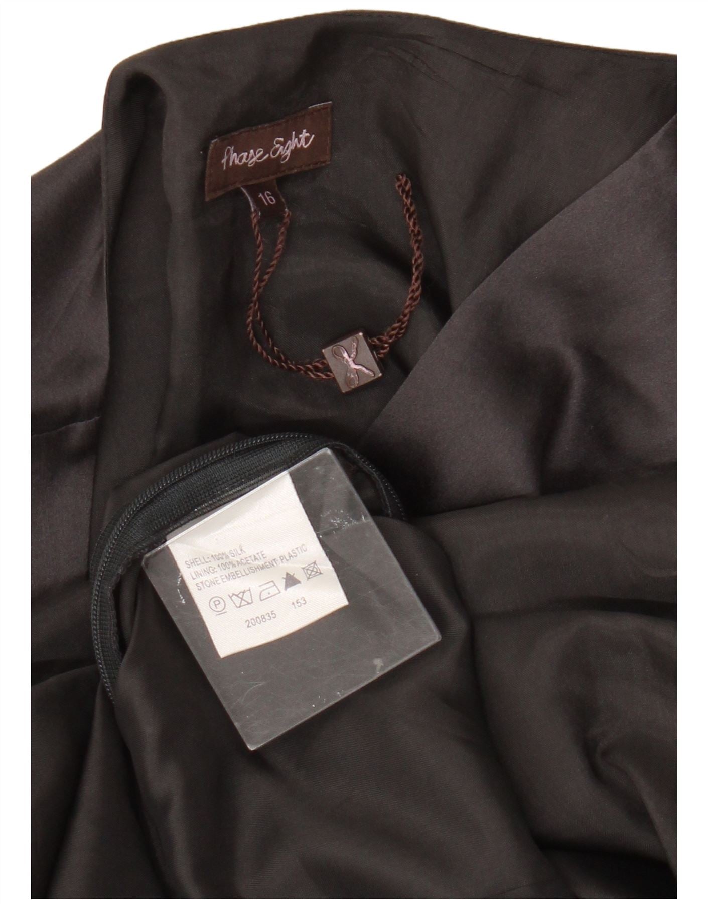 - AI Description: This Phase Eight womens Empire dress is crafted from luxurious brown silk satin. It features a flattering V-neckline and a sleeveless design. The empire waist is accentuated by a stylish wrap detail. A striking stone embellishment adorns the front, adding a touch of sparkle. The dress is fully lined for a smooth drape. A concealed zip closure ensures a seamless finish. This regular fit dress offers elegant sophistication for any special occasion.