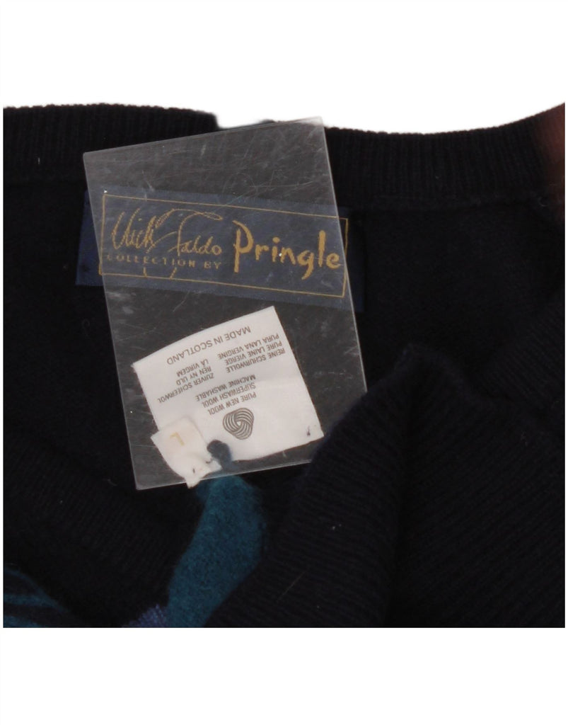PRINGLE Mens V-Neck Jumper Sweater Large Navy Blue Geometric New Wool