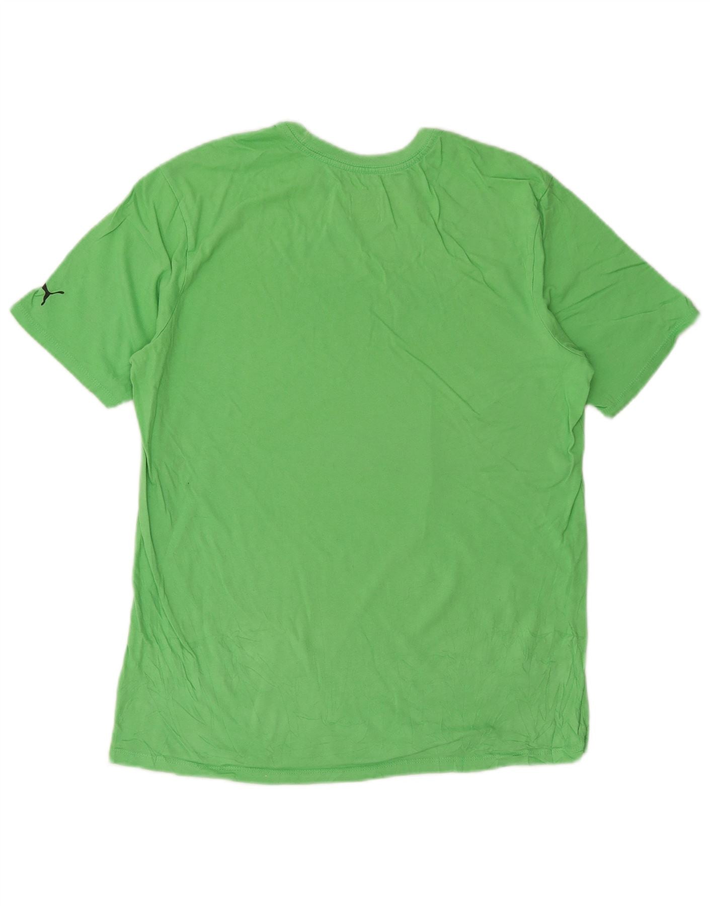 - AI Description: This Puma mens Graphic T-Shirt Top is crafted from soft green jersey fabric. It features a classic round neck and short sleeves. The pullover style offers a comfortable regular fit. A prominent black Puma logo is printed on the chest, adding a sporty accent. This versatile top is ideal for casual wear or athletic activities.
