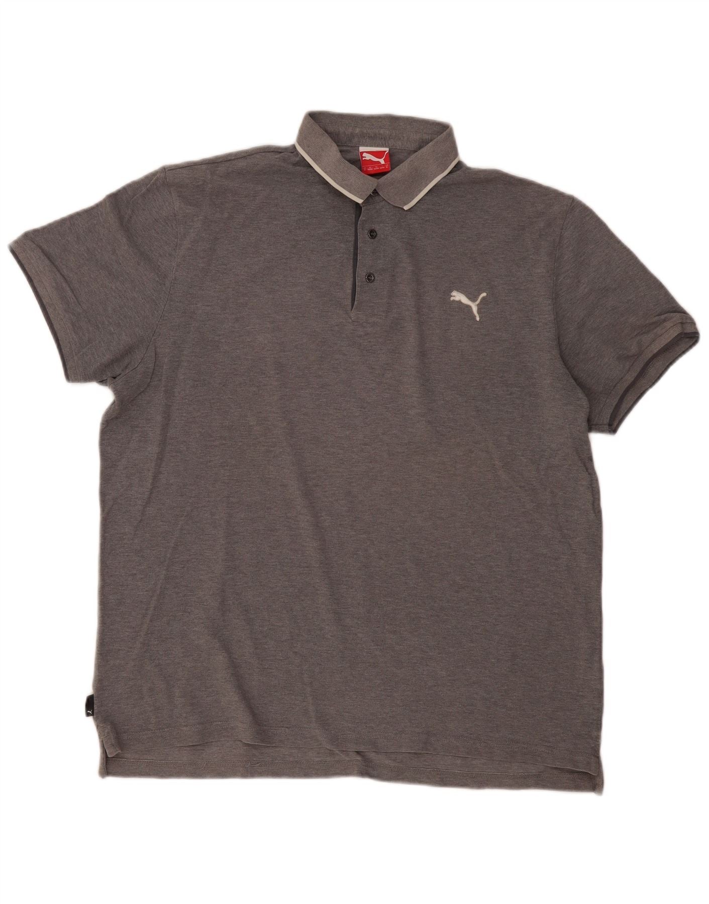 - AI Description: This Puma mens polo shirt is crafted from a comfortable grey knit fabric. It features a classic collared neckline with crisp white tipping, and a three-button placket. Short sleeves and a regular fit ensure ease of movement and a smart silhouette. The iconic Puma logo is subtly embroidered on the chest, adding a signature sports accent. This versatile top is perfect for a casual yet refined look.