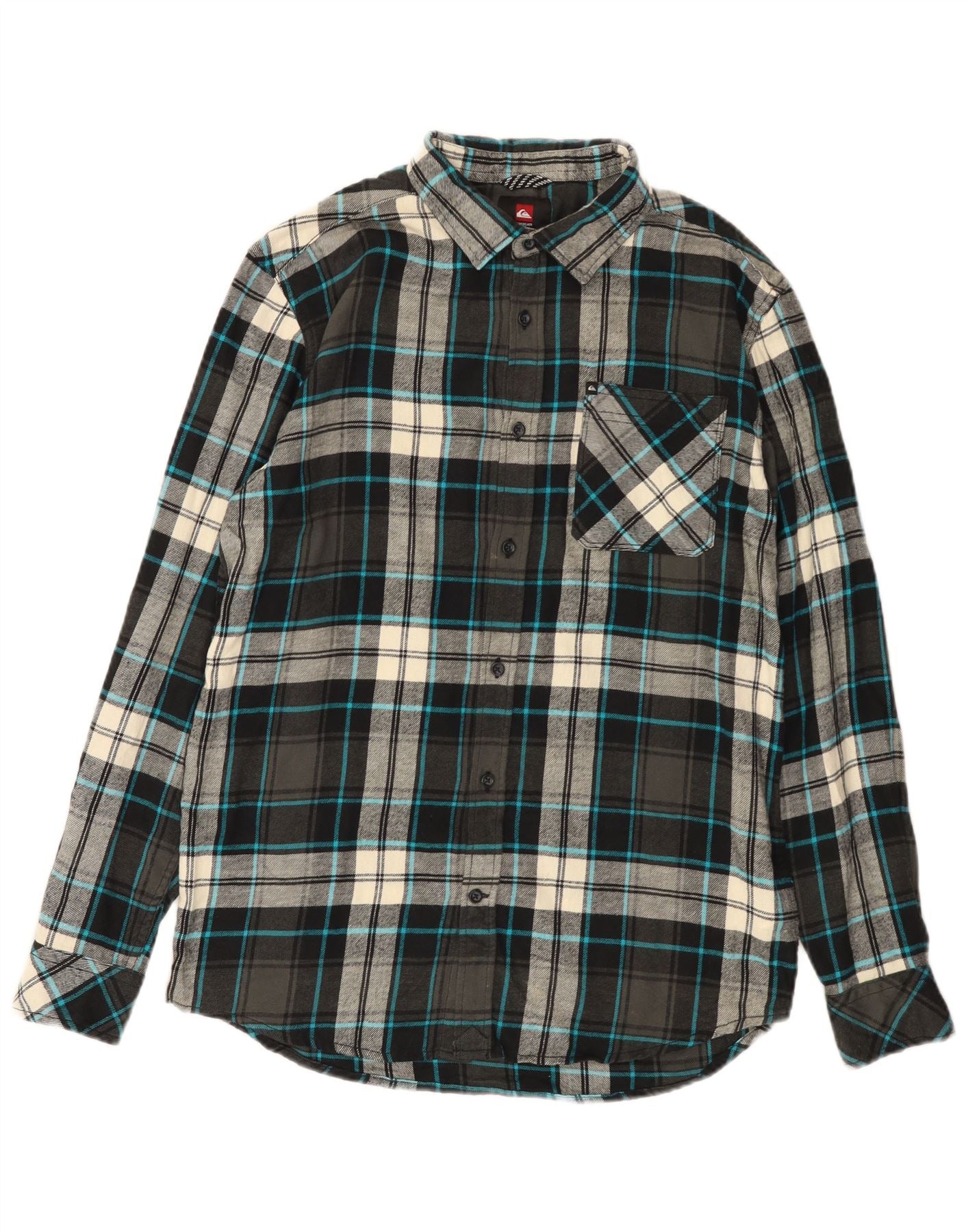 - AI Description: This Quiksilver mens flannel shirt is crafted from soft 100 percent cotton flannel. It features a classic multicoloured plaid pattern in black, grey, and blue tones. The collared neckline and full button-up front offer a timeless look. Long sleeves with buttoned cuffs and a chest pocket add practical detail. A regular fit ensures comfortable wear and easy layering. A subtle logo accent completes the design.