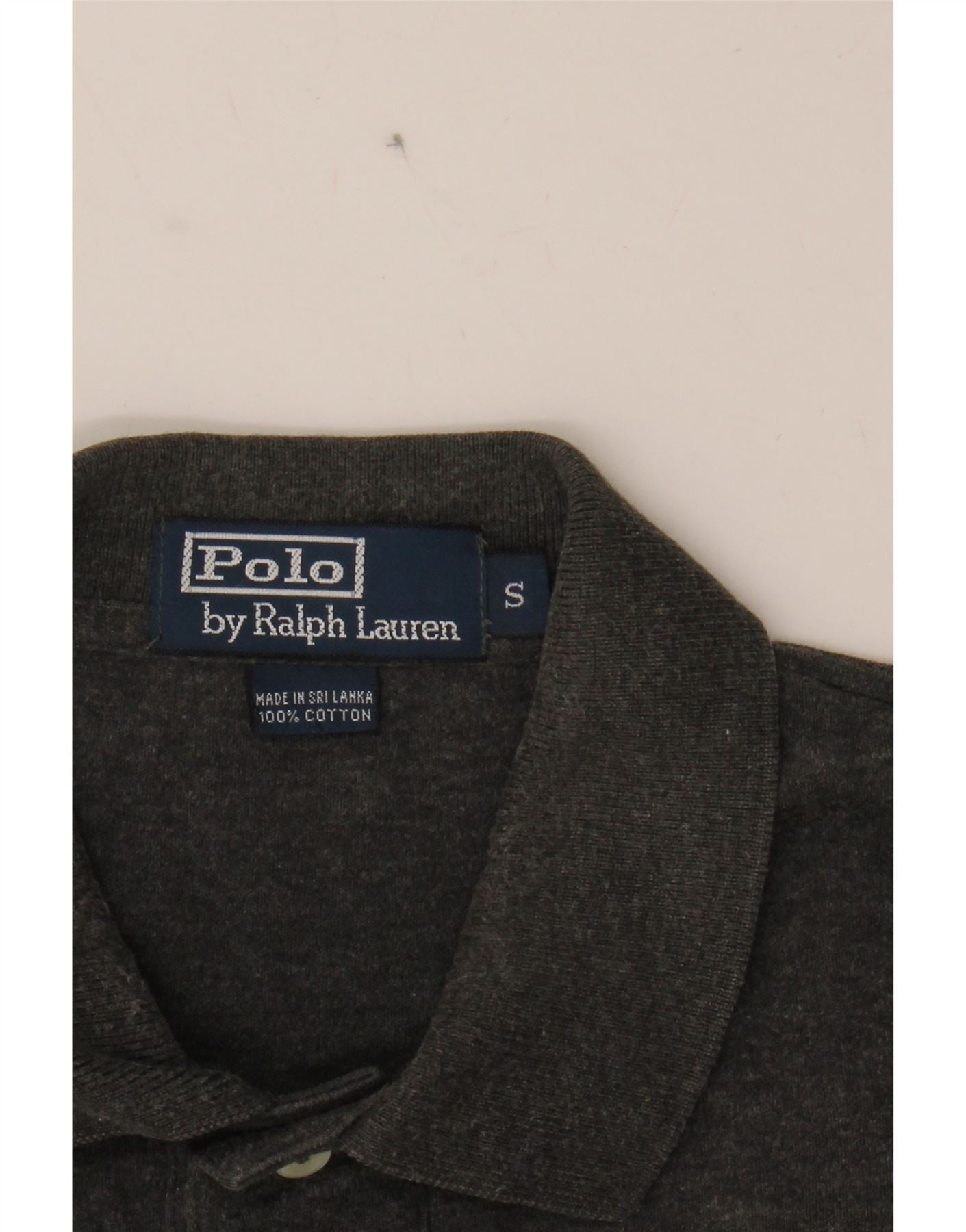 - AI Description: This pre-owned Ralph Lauren polo shirt is a classic wardrobe staple. Crafted from 100% cotton jersey, it offers a comfortable regular fit. The short-sleeved, grey polo features a collared neckline and button closure. Accented with the brand's logo, it also boasts embroidered detailing and a pleated design. While in excellent condition, minor visible wear is present overall. Size S. Made in Sri Lanka.