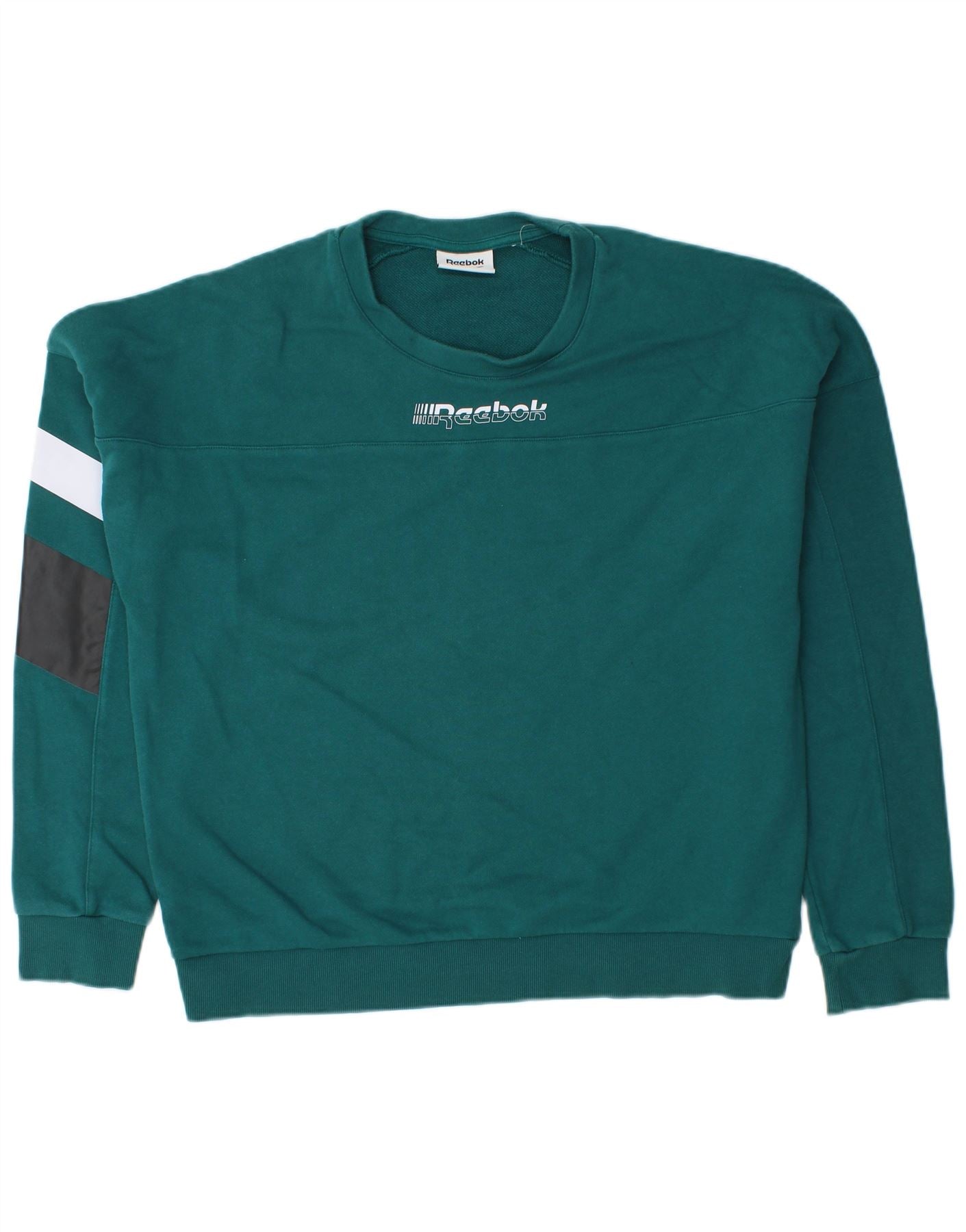 - AI Description: This Reebok mens sweatshirt jumper is crafted from a comfortable polyester cotton blend jersey. It features a classic round neck and long sleeves with cuffed detailing. The regular fit ensures ease of movement. A distinctive colourblock pattern on the sleeve adds a modern touch. The front displays a graphic logo, enhancing its sporty appeal.