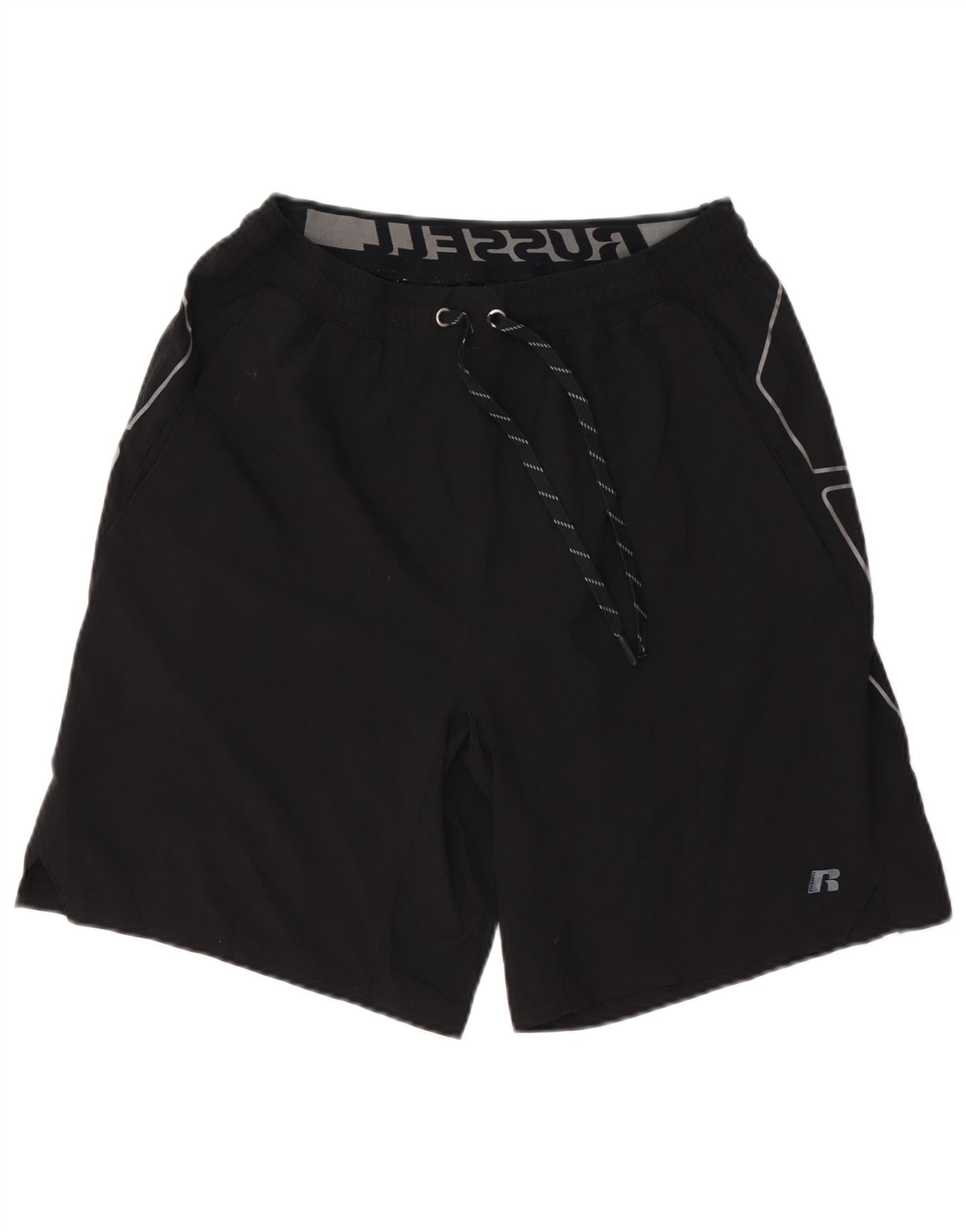 - AI Description: This Russell Athletic mens casual shorts are crafted from a lightweight black polyester knit. The fabric blend of 90% polyester and 10% spandex offers breathability and an athletic fit. An elasticated waistband with a drawstring closure ensures comfort and adjustability. Grey trim detailing and a subtle Russell logo on the leg add a sporty touch. The regular fit provides ease of movement for various activities.