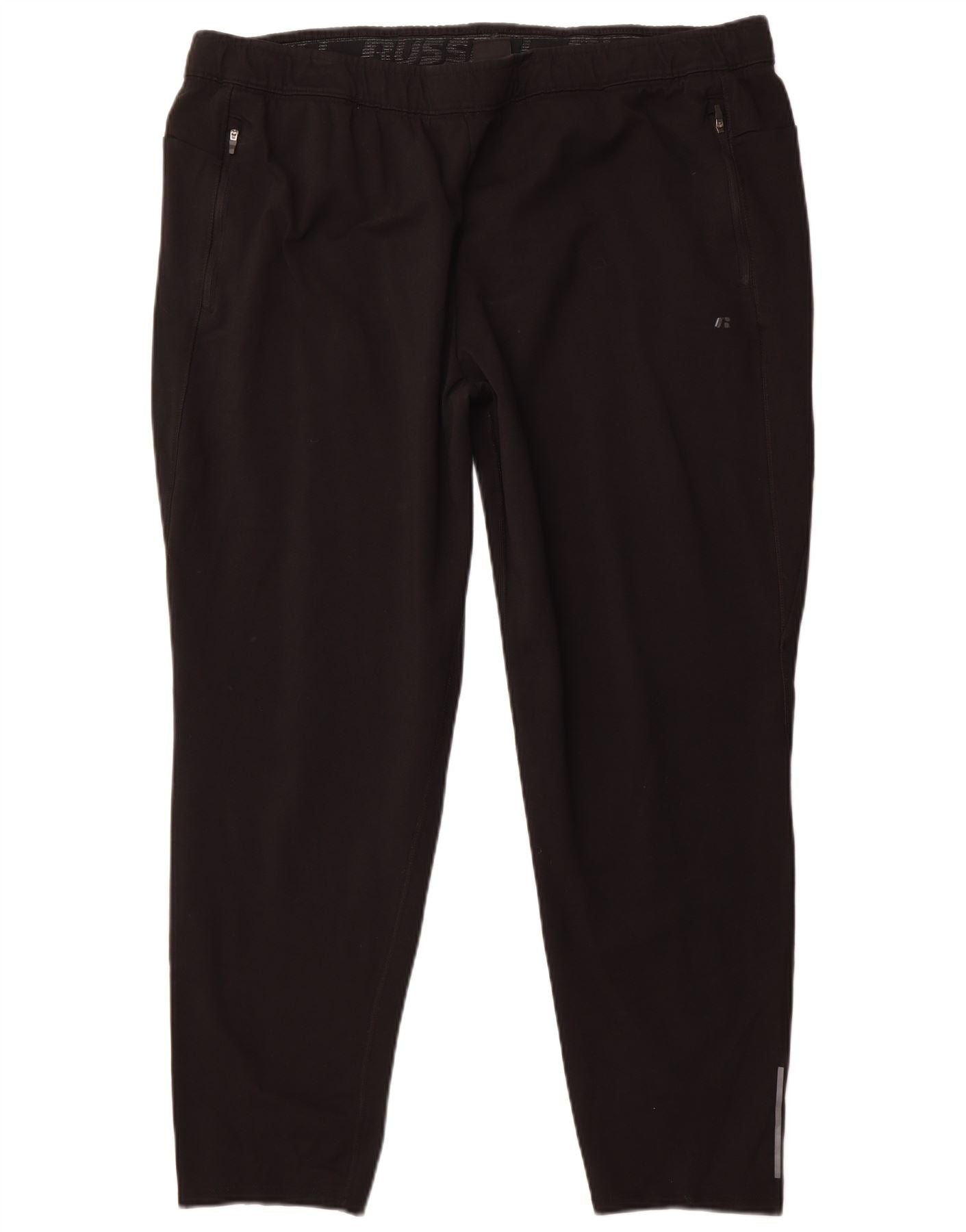 - AI Description: These RUSSEL mens tracksuit trousers joggers are crafted from a black blended fabric, offering a smooth feel. They feature an elasticated pull on waist with a visible logo detail. The athletic regular fit ensures comfort and ease of movement. Side pockets provide practical storage. A subtle reflective detail is present on the lower leg, enhancing visibility. The design is clean and functional, perfect for sports activities.