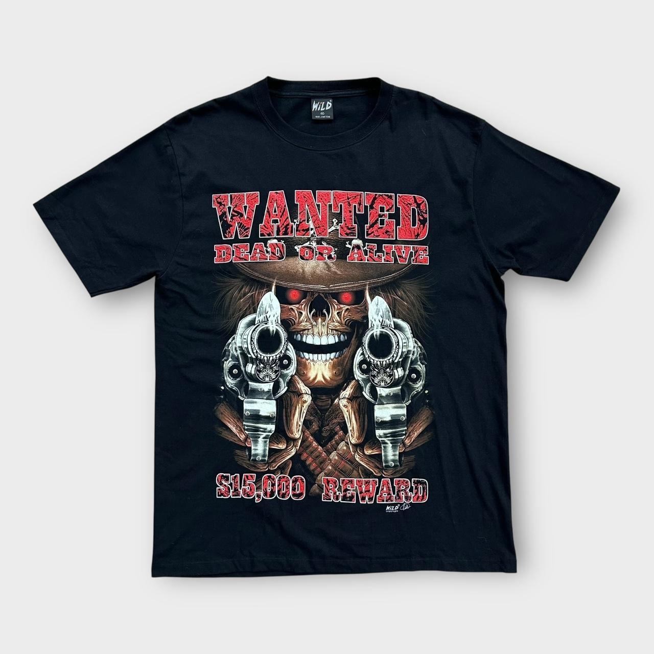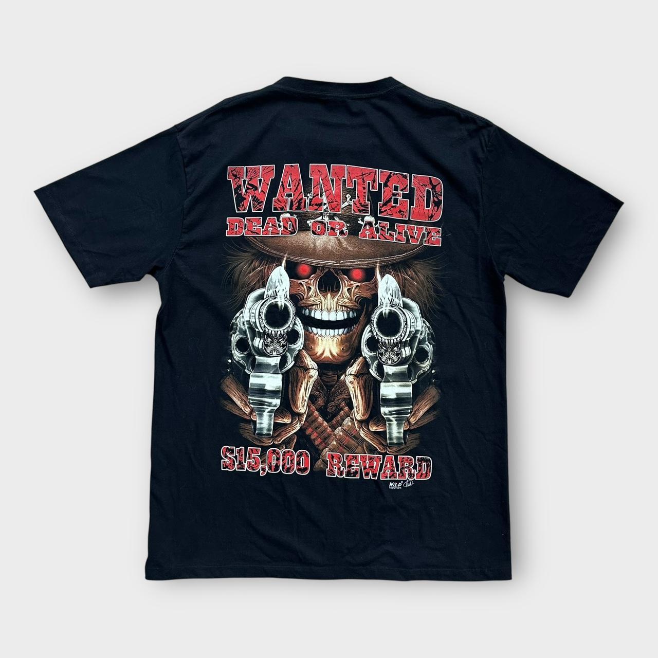 Early 2000’s skull graphic tee “Wanted dead or alive” with print on the chest and back on a wild tag. Also has metal details on the front