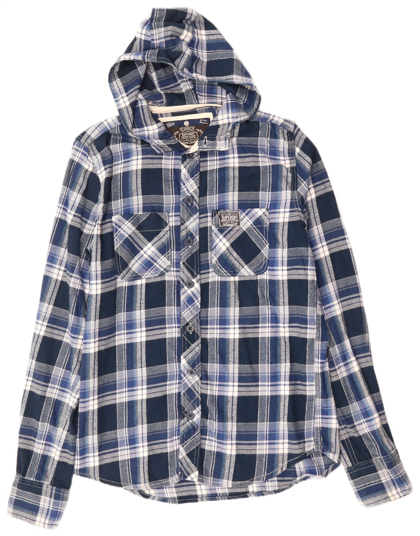 SUPERDRY Mens Hooded Flannel Shirt Medium Blue Check Cotton