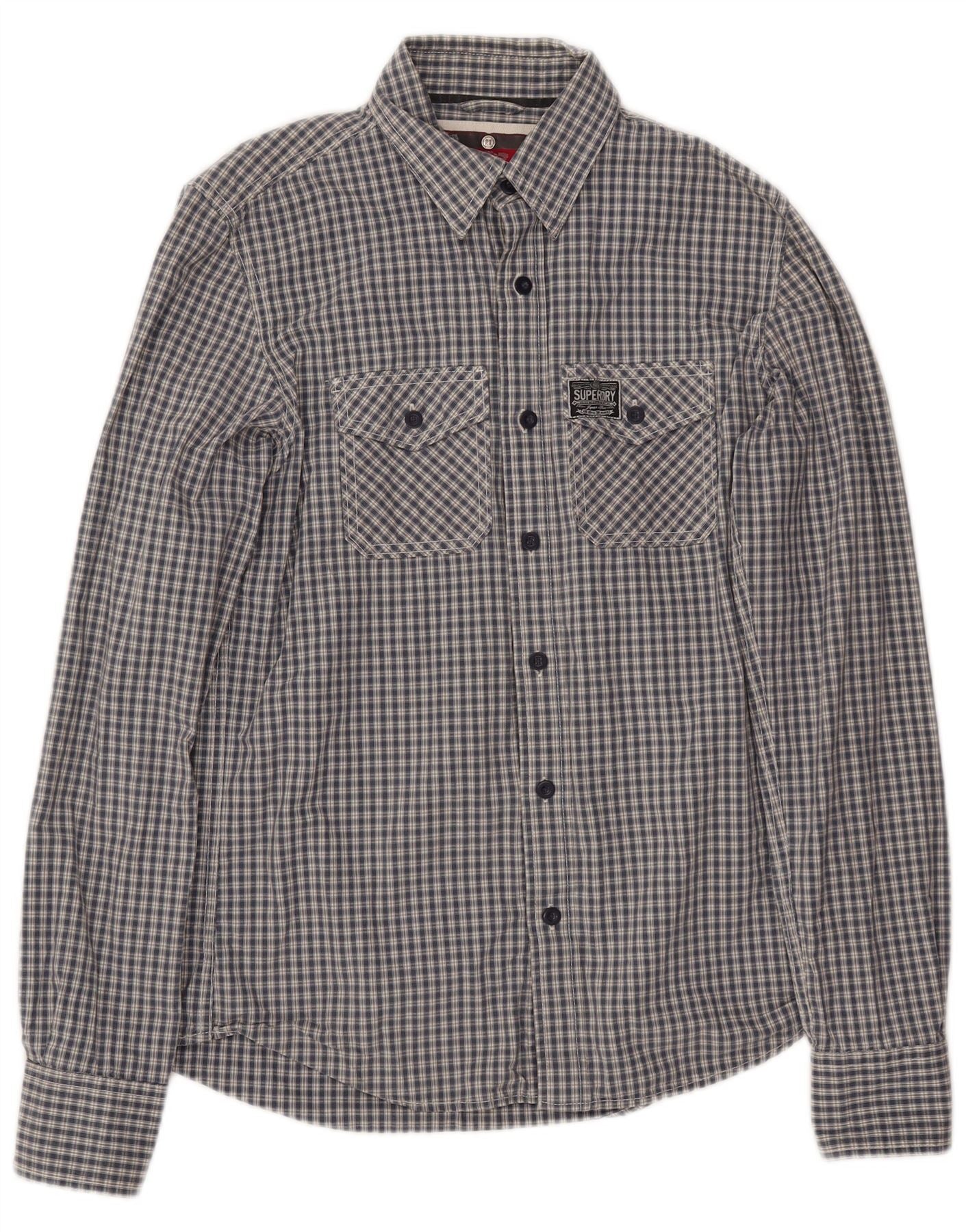 - AI Description: This Superdry mens shirt is crafted from 100 percent woven cotton, featuring a grey check pattern. It has a collared neckline and long sleeves with buttoned cuffs. The button-up front and twin chest pockets add practical detail. A subtle logo accent completes the design. The regular fit ensures comfortable wear, making it a versatile wardrobe staple.