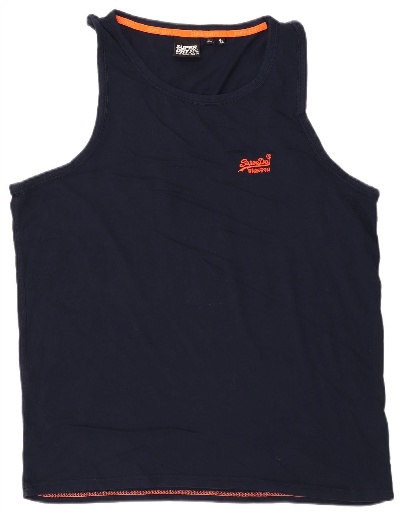 - AI Description: This Superdry mens Vest Top is crafted from soft navy blue cotton jersey. It features a classic round neck and a sleeveless design. The regular fit ensures comfort and ease of movement. An orange Superdry logo is prominently displayed on the chest. The hem and neckline feature subtle orange stitching for a contrasting detail. This lightweight and breathable top is perfect for casual wear.