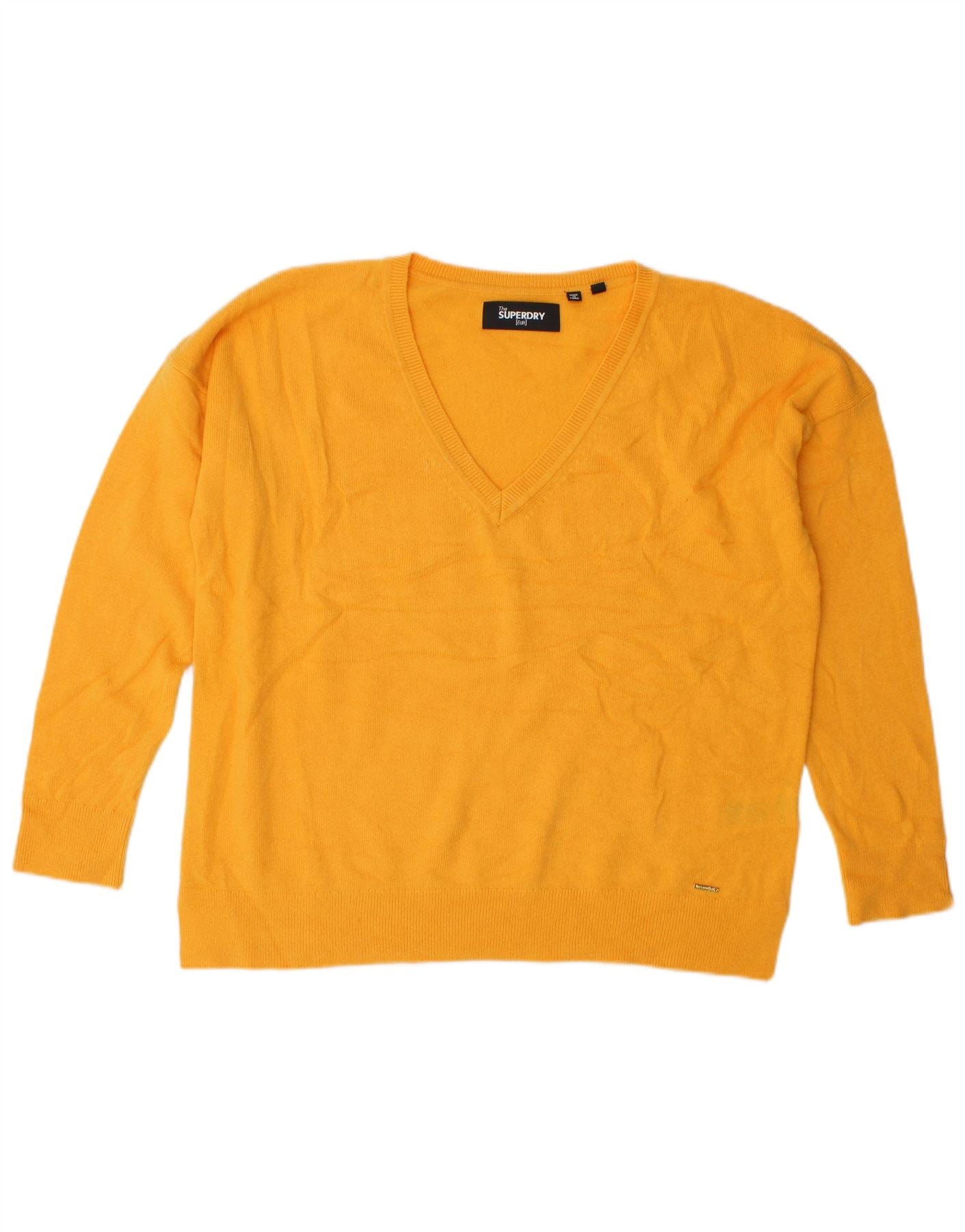 SUPERDRY Womens Oversized V-Neck Jumper Sweater UK 10 Small Yellow Wool