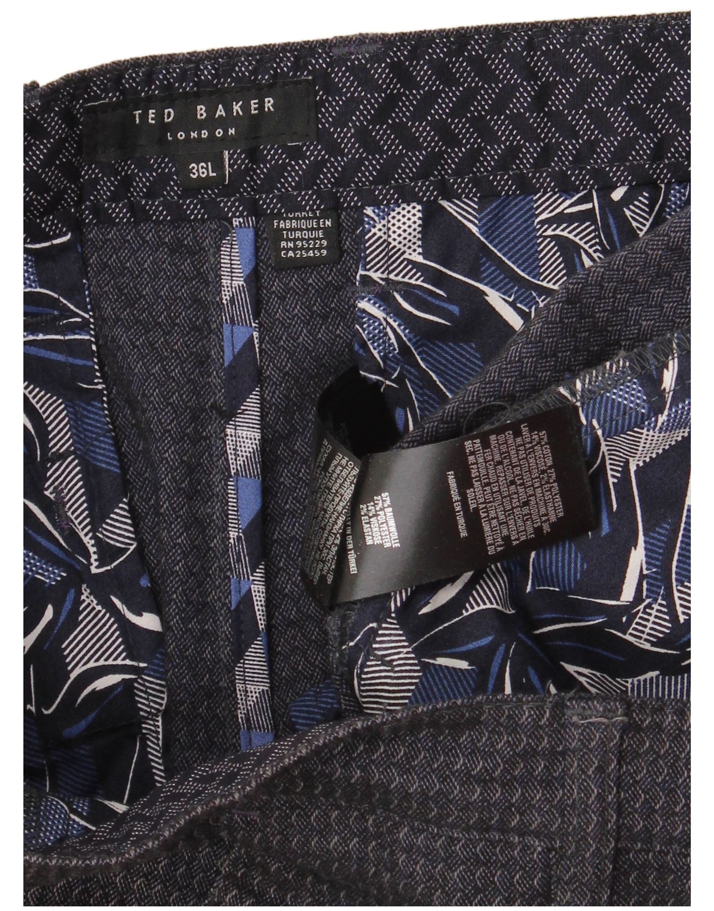 - AI Description: These Ted Baker men's casual trousers are crafted from a navy blue wool blend, featuring a subtle geometric pattern. The fabric offers a comfortable stretch for ease of movement. They feature a regular fit and a classic button closure. Practical pockets are included for convenience. The design is smart and versatile, perfect for a refined casual look.