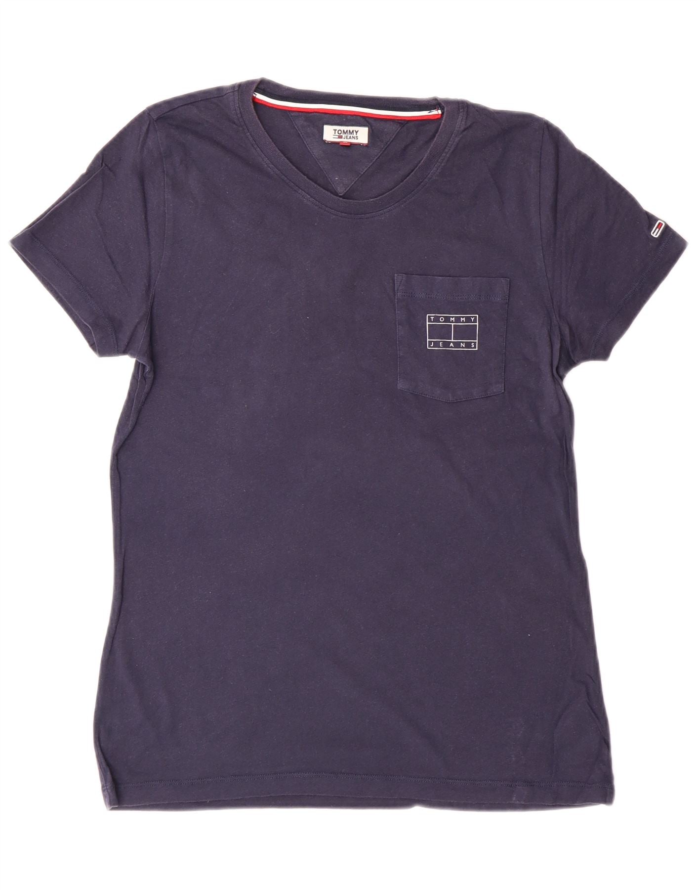- AI Description: This Tommy Hilfiger womens Graphic T-Shirt Top is crafted from soft navy blue 100 percent cotton jersey. It features a classic V-neckline and comfortable short sleeves. The regular fit ensures a relaxed silhouette. A subtle chest pocket with an embroidered logo adds a signature touch. This pullover style offers effortless wear for everyday comfort.
