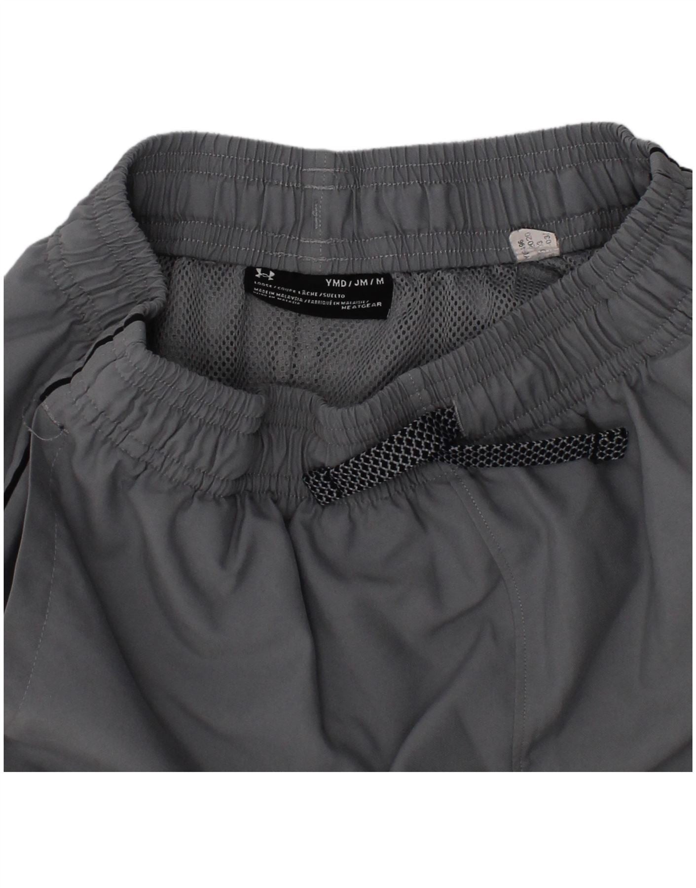 - AI Description: This Under Armour boys' shorts are crafted from a grey woven fabric, offering a breathable feel. An elasticated waistband with a drawstring closure ensures a secure, comfortable fit. The regular fit provides ease of movement for active wear. Practical side pockets are included. A prominent Under Armour logo features on the leg, enhancing the athletic style.