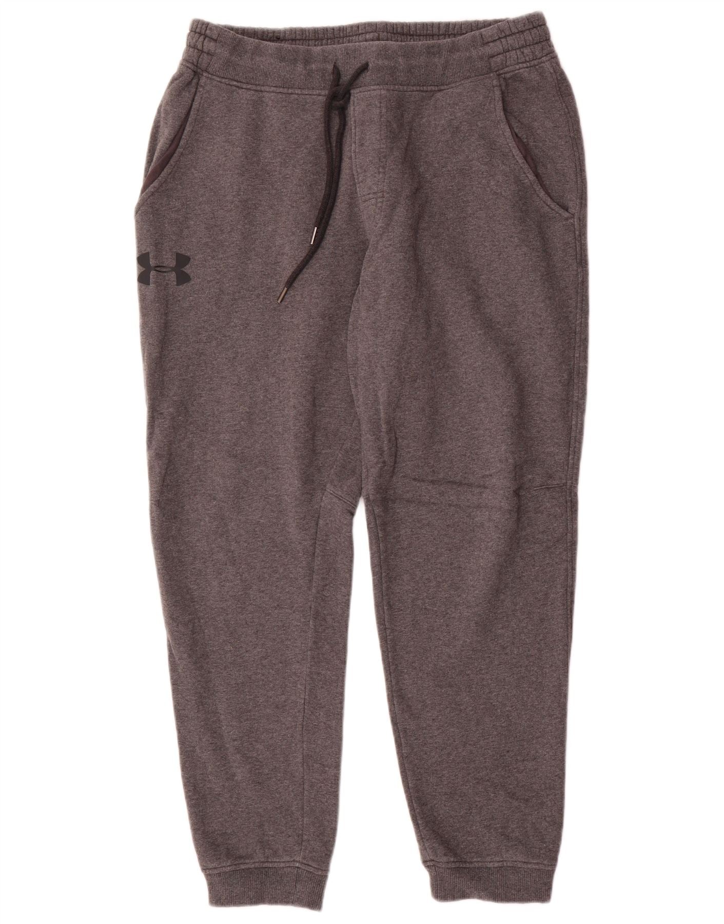 - AI Description: This Under Armour mens tracksuit trousers joggers are crafted from a soft grey cotton polyester blend fleece fabric. They feature a comfortable elasticated waist with a practical drawstring closure. The slim fit design tapers neatly to the ankle. Side pockets offer convenient storage. A subtle Under Armour logo provides a signature accent. These joggers prioritise comfort and athletic style.
