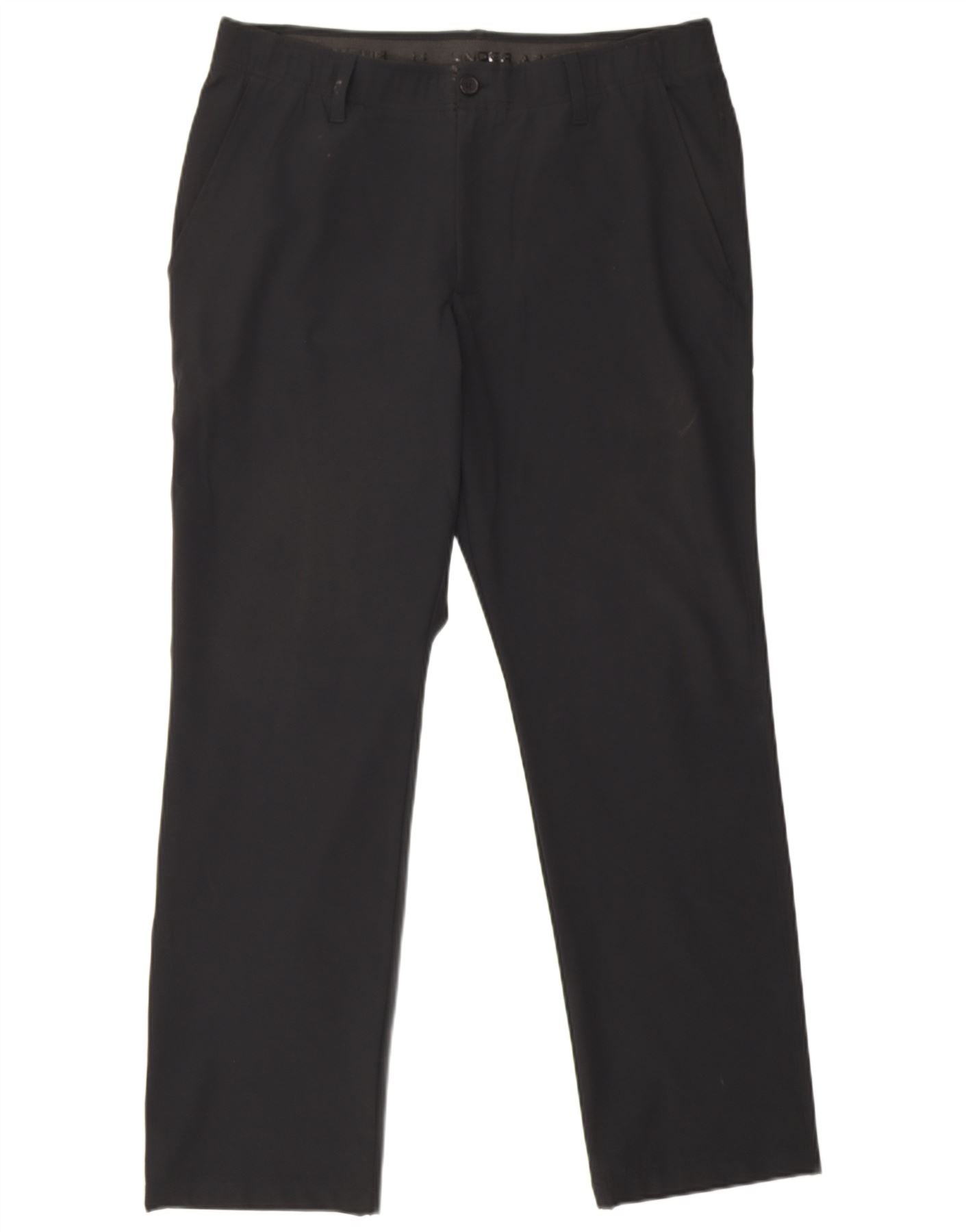 - AI Description: This Under Armour mens trousers are crafted from a black woven fabric, offering excellent stretch and comfort. They feature a regular fit, ensuring ease of movement on the golf course. The design includes a secure button closure and practical pockets for essentials. A subtle Under Armour logo provides a signature accent. These sports trousers are perfectly suited for golf, combining performance with a smart appearance.
