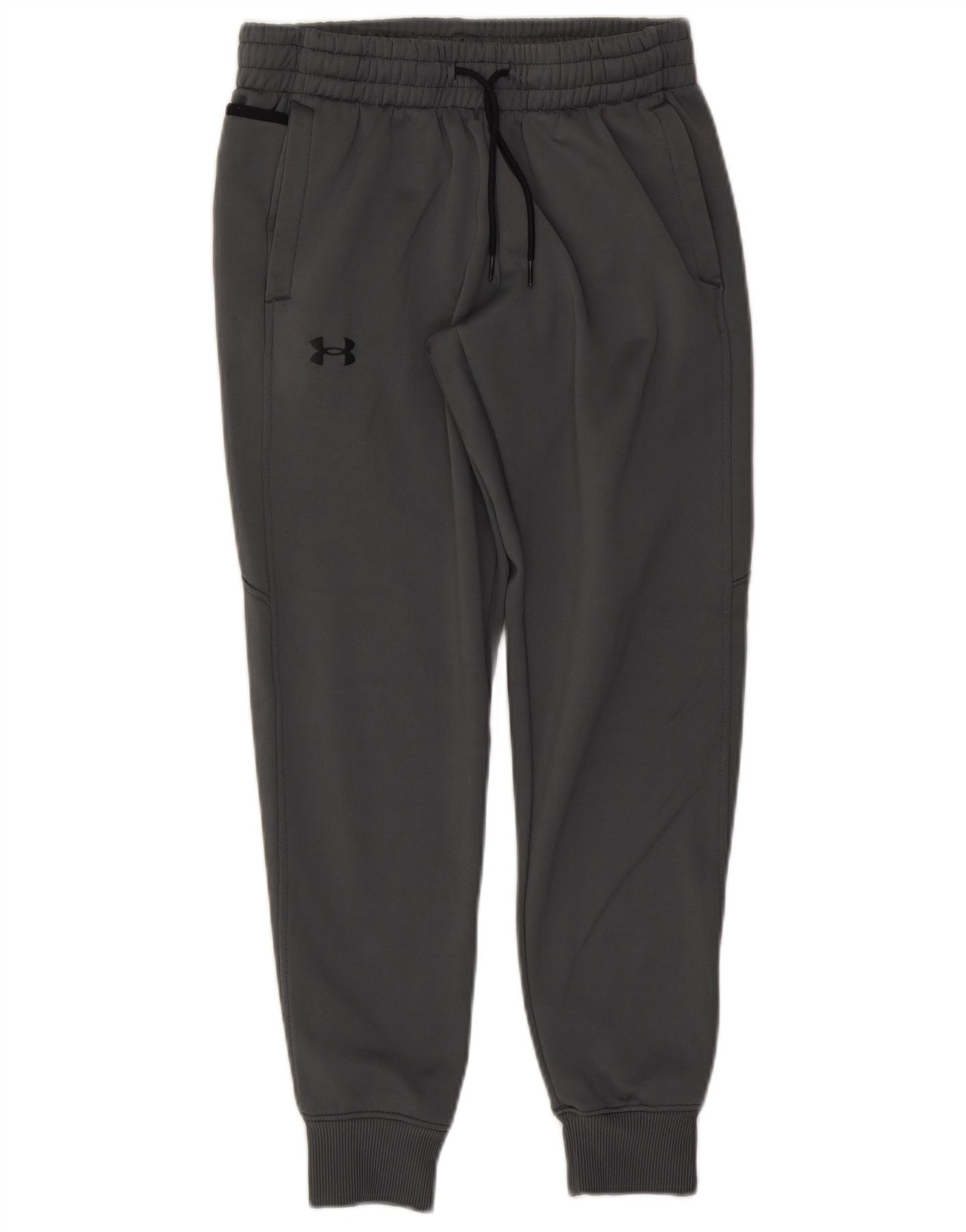 - AI Description: This Under Armour mens tracksuit joggers are crafted from a comfortable grey knit blend of polyester and cotton. They feature a thermal design for warmth and an elasticated drawstring waist for a secure, adjustable fit. The loose, relaxed cut ensures maximum comfort and freedom of movement. Practical pockets add functionality. A subtle brand logo provides a signature athletic detail.