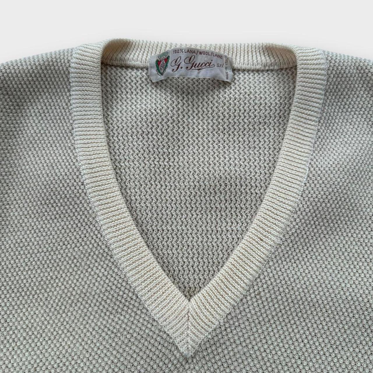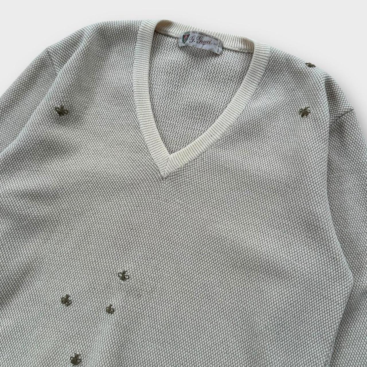 Vintage original 1990’s Gucci knit jumper in beige with embroidered Gs and Gucci bees throughout shown in the pics