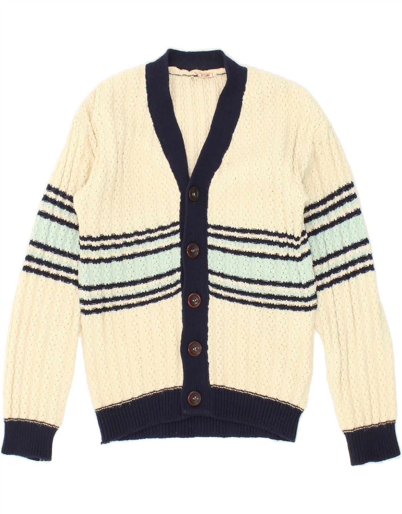 VINTAGE Boys Cardigan Sweater 14-15 Years Off White Striped Acrylic