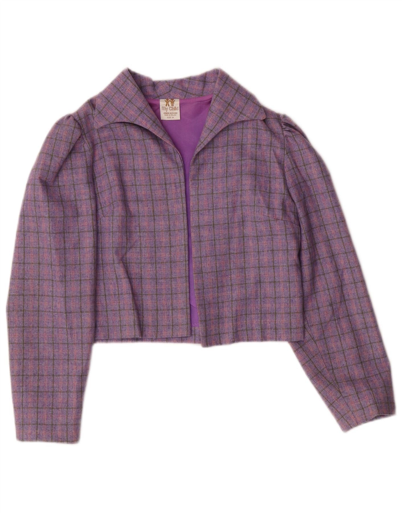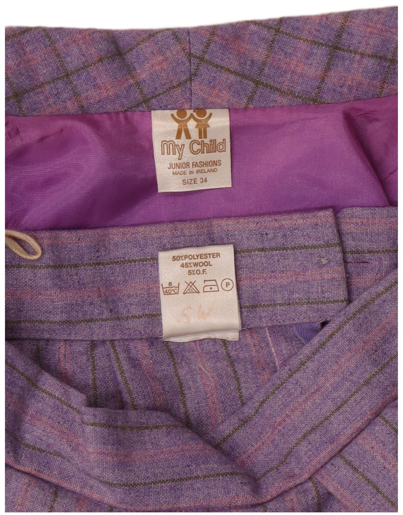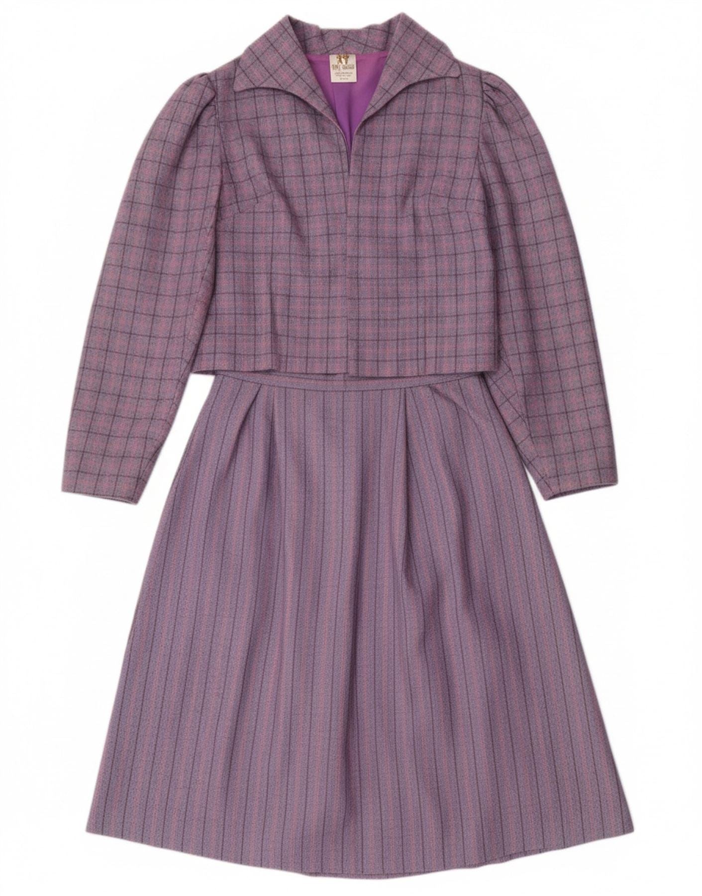 - AI Description: This Vintage girls' 2 Piece Skirt Set features a purple plaid tweed in a regular fit. Crafted in Ireland from 50% polyester and 48% wool, the set includes a collared, long-sleeve jacket with a button closure and shoulder pads. The lined skirt completes the classic look. The plaid pattern adds a touch of timeless style.