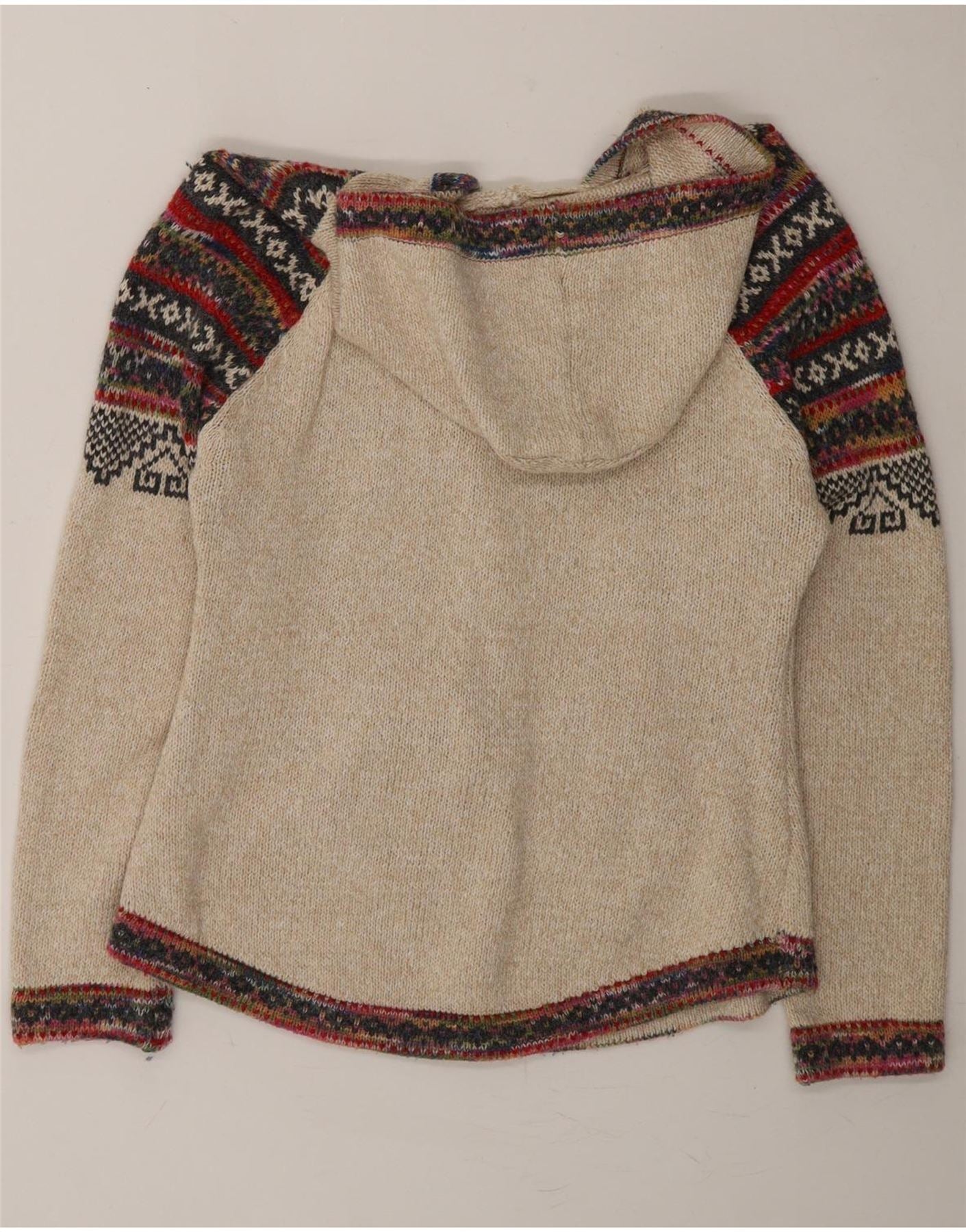 VINTAGE Girls Hooded Jumper 9-10 Years Beige Fair Isle Cotton