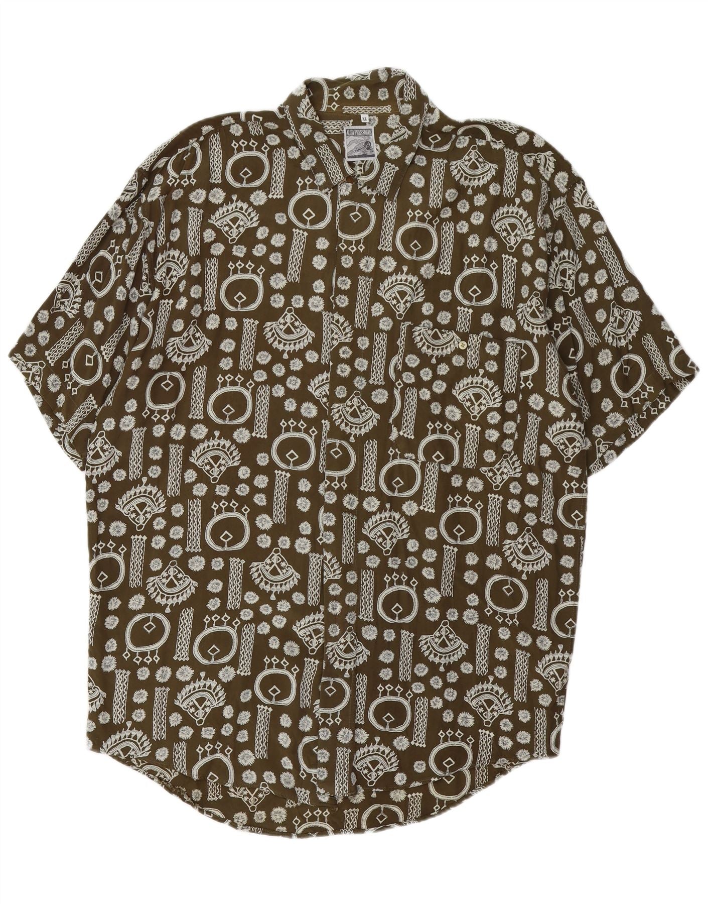 Vintage Mens Abstract Pattern Short Sleeve Shirt XL Khaki
