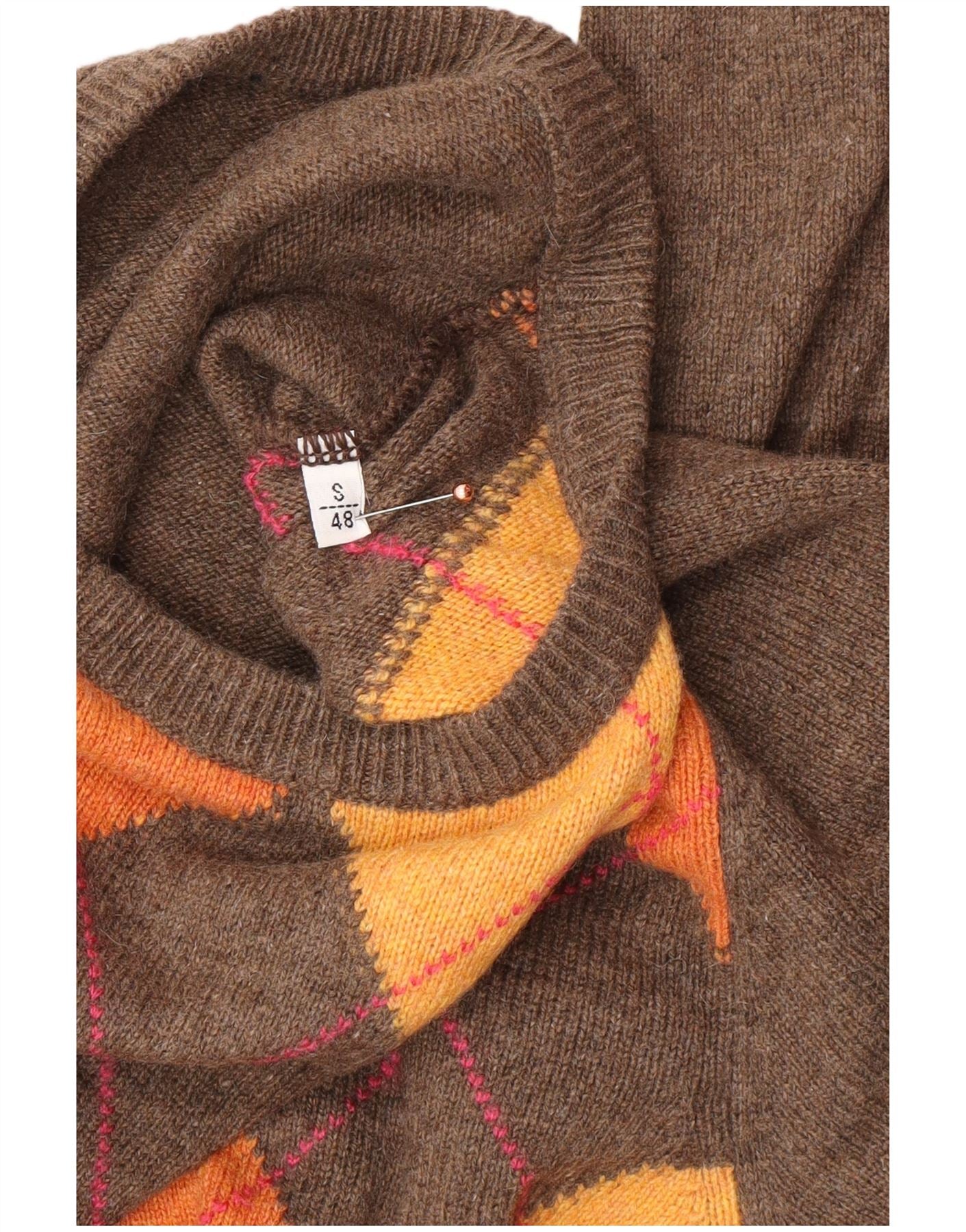 VINTAGE Mens Crew Neck Jumper Sweater IT 48 Small Brown Argyle/Diamond