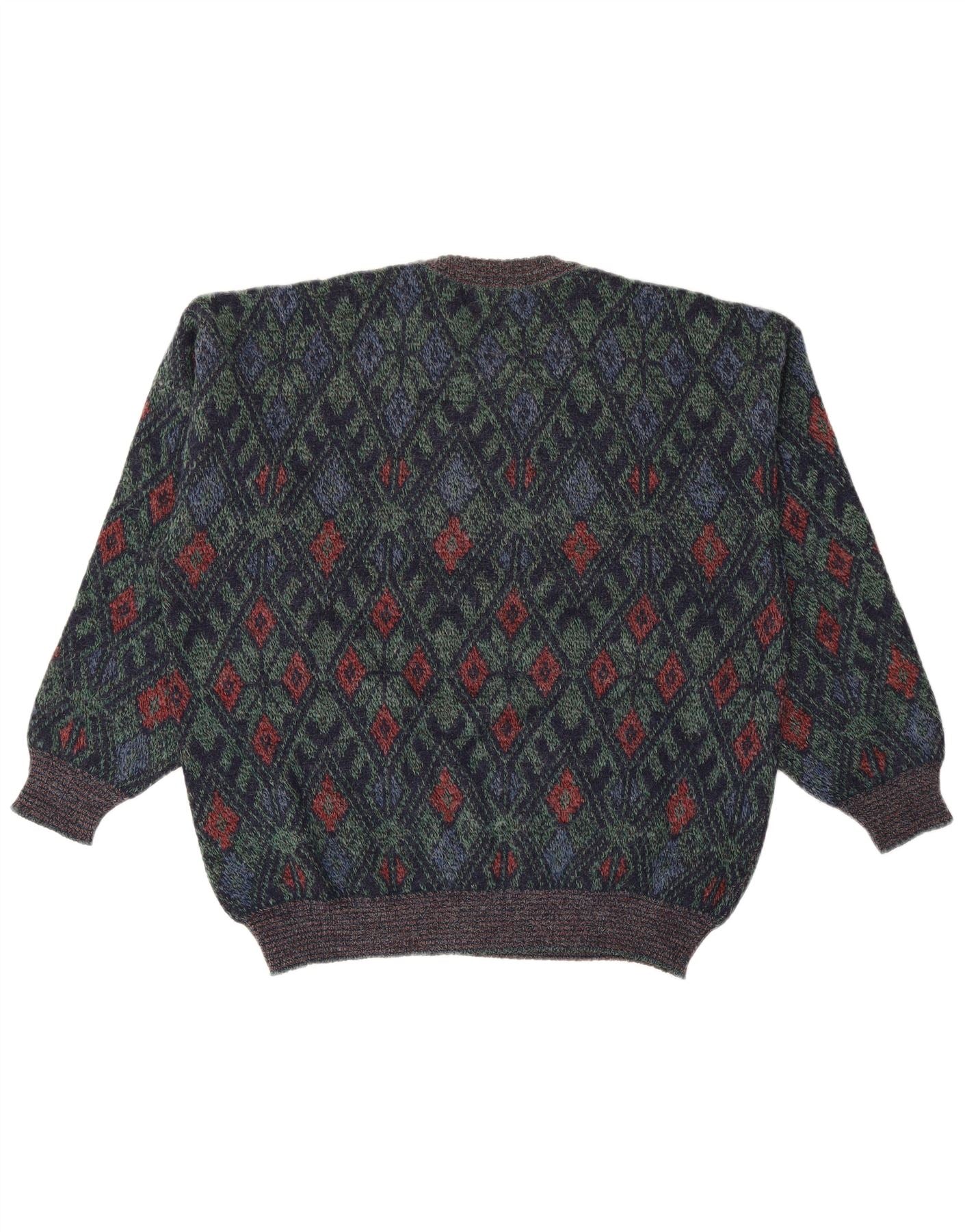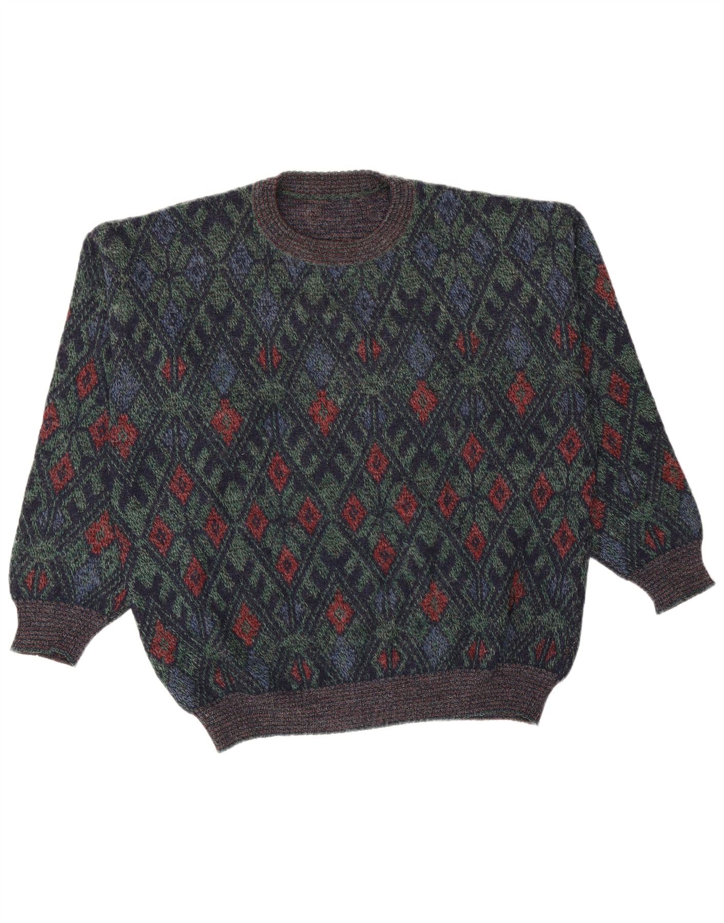 VINTAGE Mens Crew Neck Jumper Sweater Large Navy Blue Argyle/Diamond
