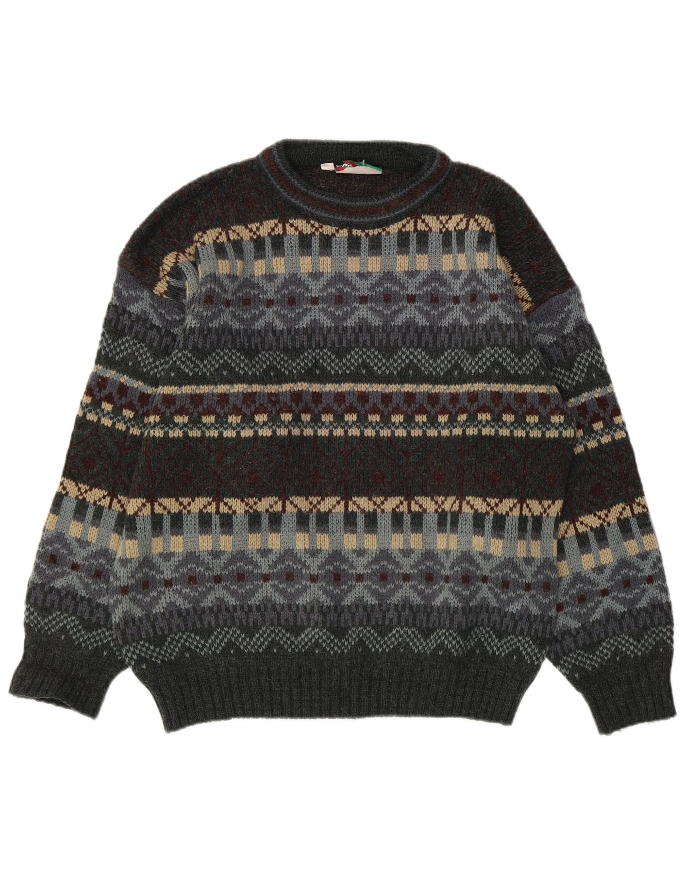 - AI Description: This Vintage mens Crew Neck Jumper Sweater is crafted from a comfortable knit fabric. It features a classic Fair Isle pattern in shades of grey, blue, beige, and maroon. The round neck and long sleeves offer a traditional silhouette. Its pullover design ensures ease of wear. The regular fit provides comfortable wear. A subtle logo detail is present.