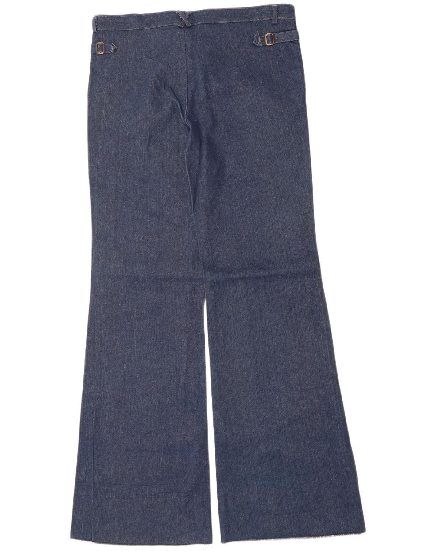 - AI Description: These Vintage mens flared jeans are crafted from sturdy navy blue denim. They feature a classic flared leg silhouette, offering a retro style. The regular fit ensures comfortable wear. A zip closure provides a neat front. Functional pockets add practicality. An adjustable waist with buckle detail allows for a personalised fit, enhancing the vintage appeal.