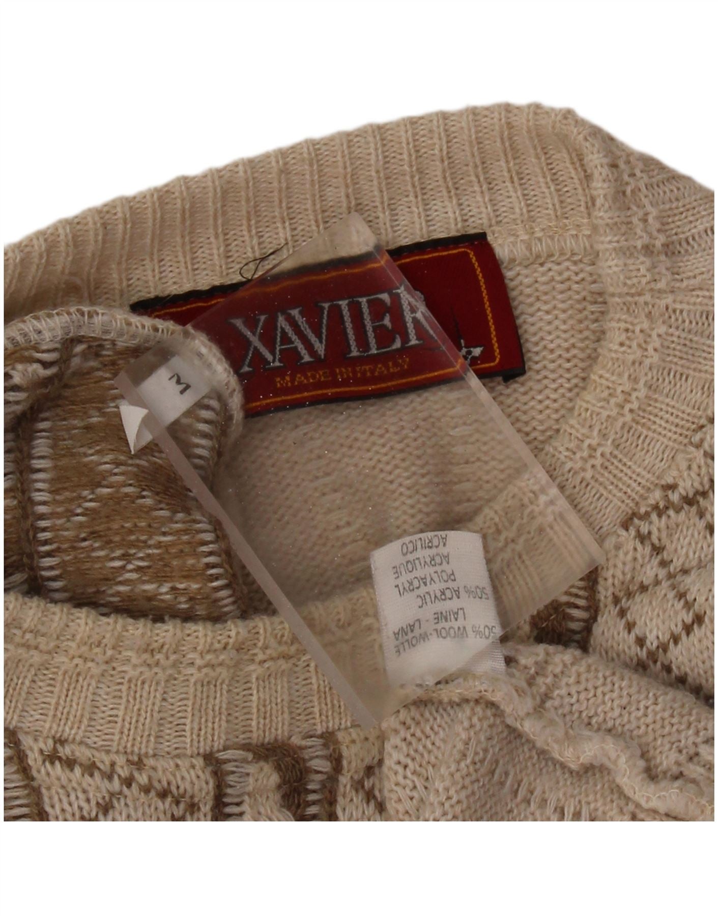 VINTAGE Mens Graphic Crew Neck Jumper Sweater Medium Beige Striped Wool