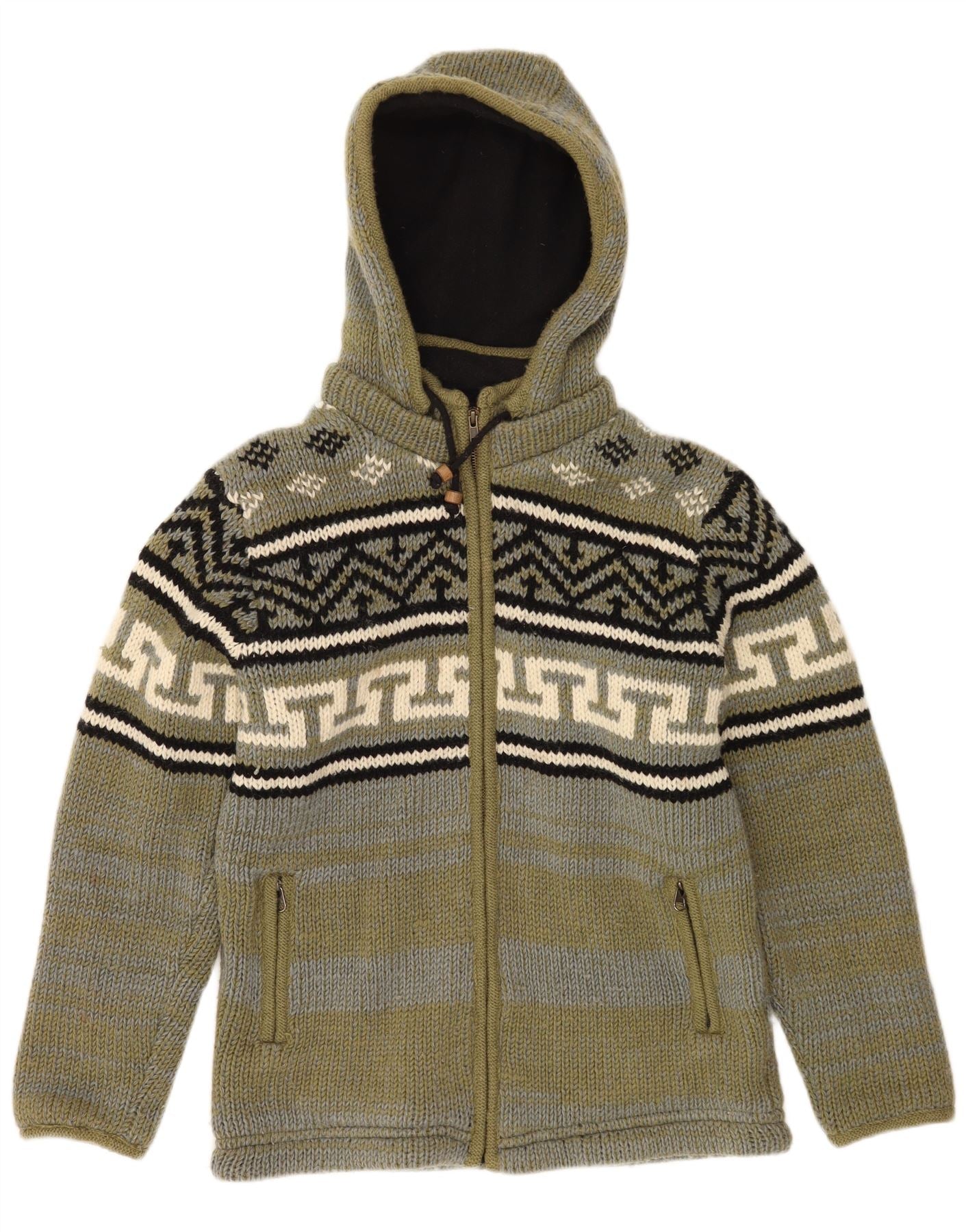 VINTAGE Mens Hooded Cardigan Sweater Medium Khaki Fair Isle Wool