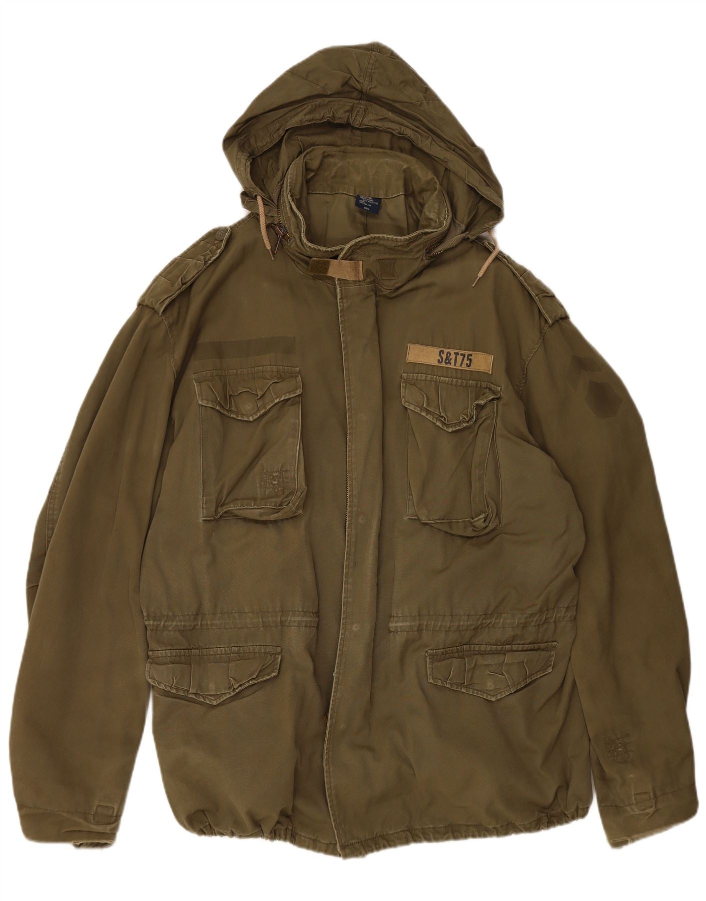 VINTAGE Mens Hooded Military Jacket UK 44 2XL Khaki Cotton