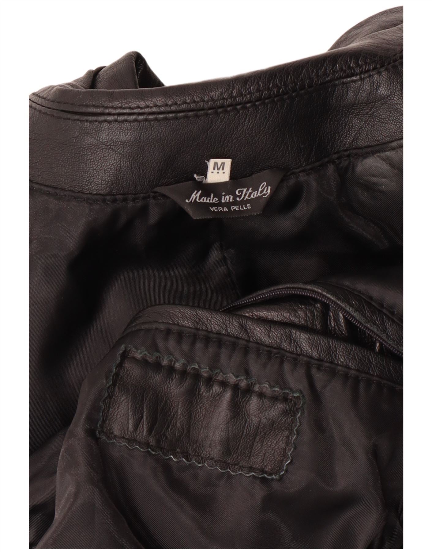 - AI Description: This Vintage men's leather jacket is crafted from smooth Vera Pelle leather. It features a classic blazer style with a button closure. The jacket has a traditional collar and long sleeves. Its classic fit offers timeless appeal. Made in Italy, this black leather jacket combines quality material with enduring style.