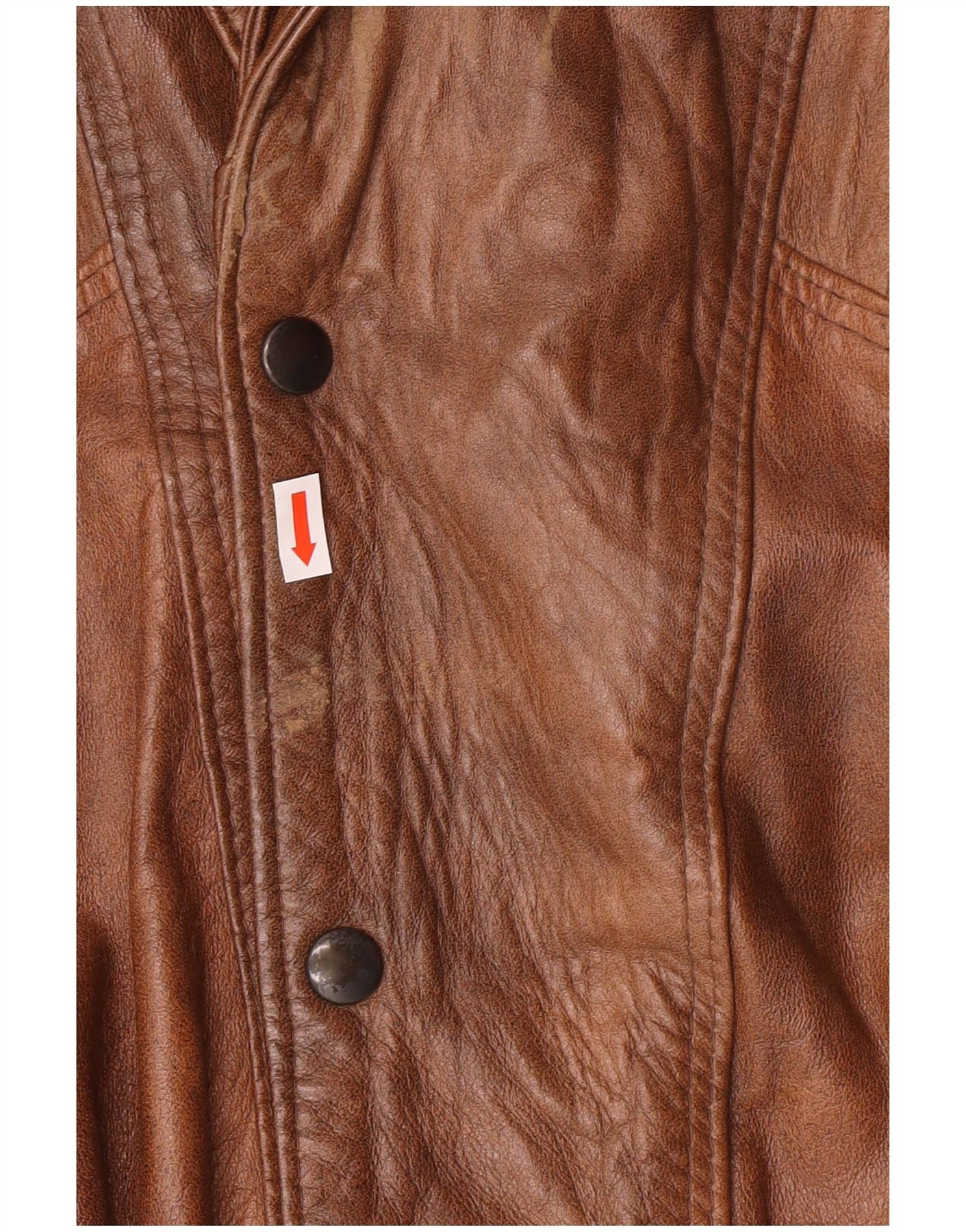 - AI Description: This Vintage men's biker jacket is crafted from brown leather with a collared neckline. The regular fit jacket features long sleeves and a button closure. It is designed with pockets, shoulder pads and is fully lined. Made in Italy, this leather jacket offers a classic biker style.