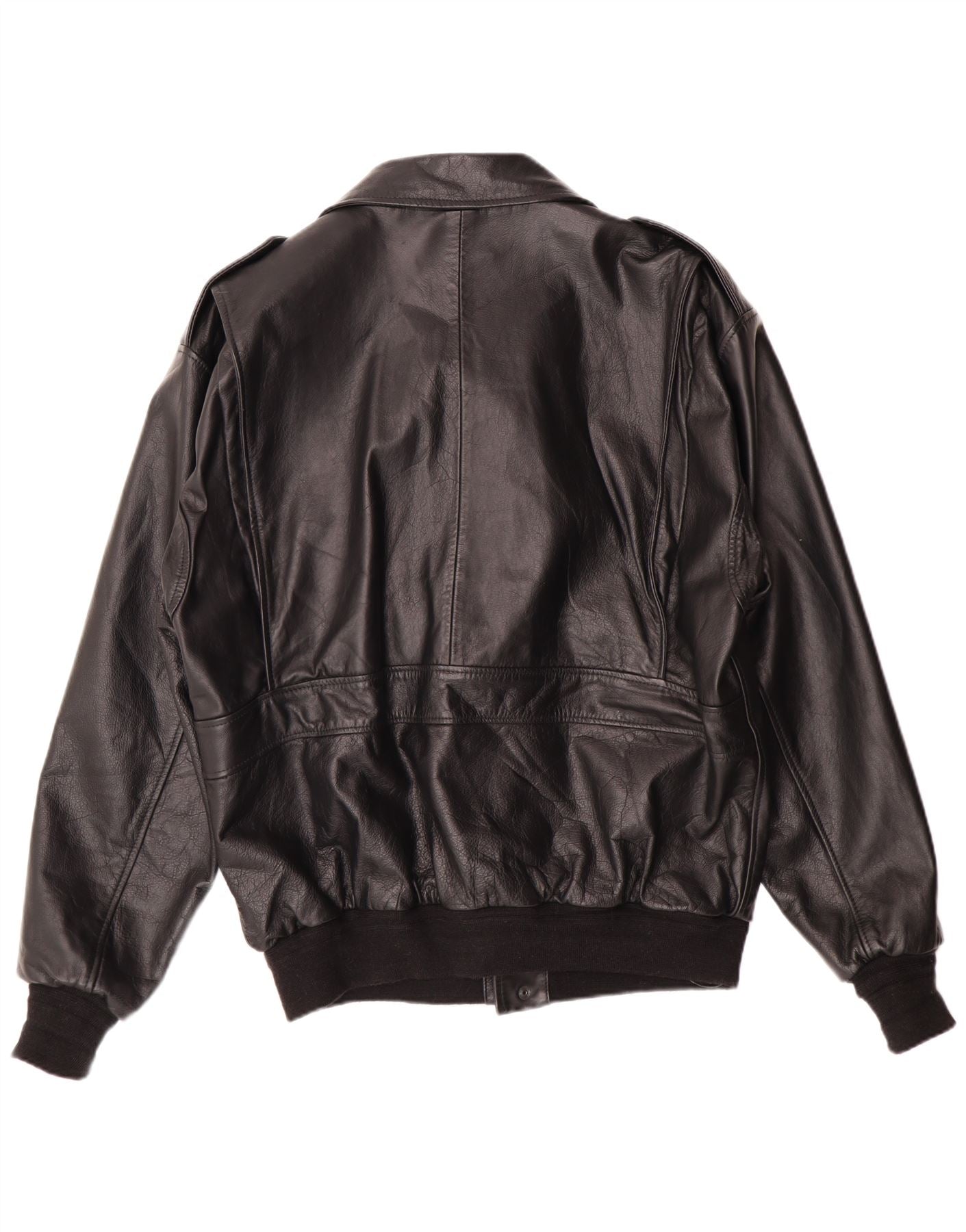 - AI Description: This Vintage mens bomber jacket is crafted from smooth black leather, exuding a classic retro style. It features a collared neckline and a full zip closure. Long sleeves finish with ribbed cuffs, complementing the ribbed hem. Two large front pockets with buttoned flaps provide practical detail. Shoulder epaulettes with button accents enhance its authentic aviator look. The regular fit ensures comfortable wear.