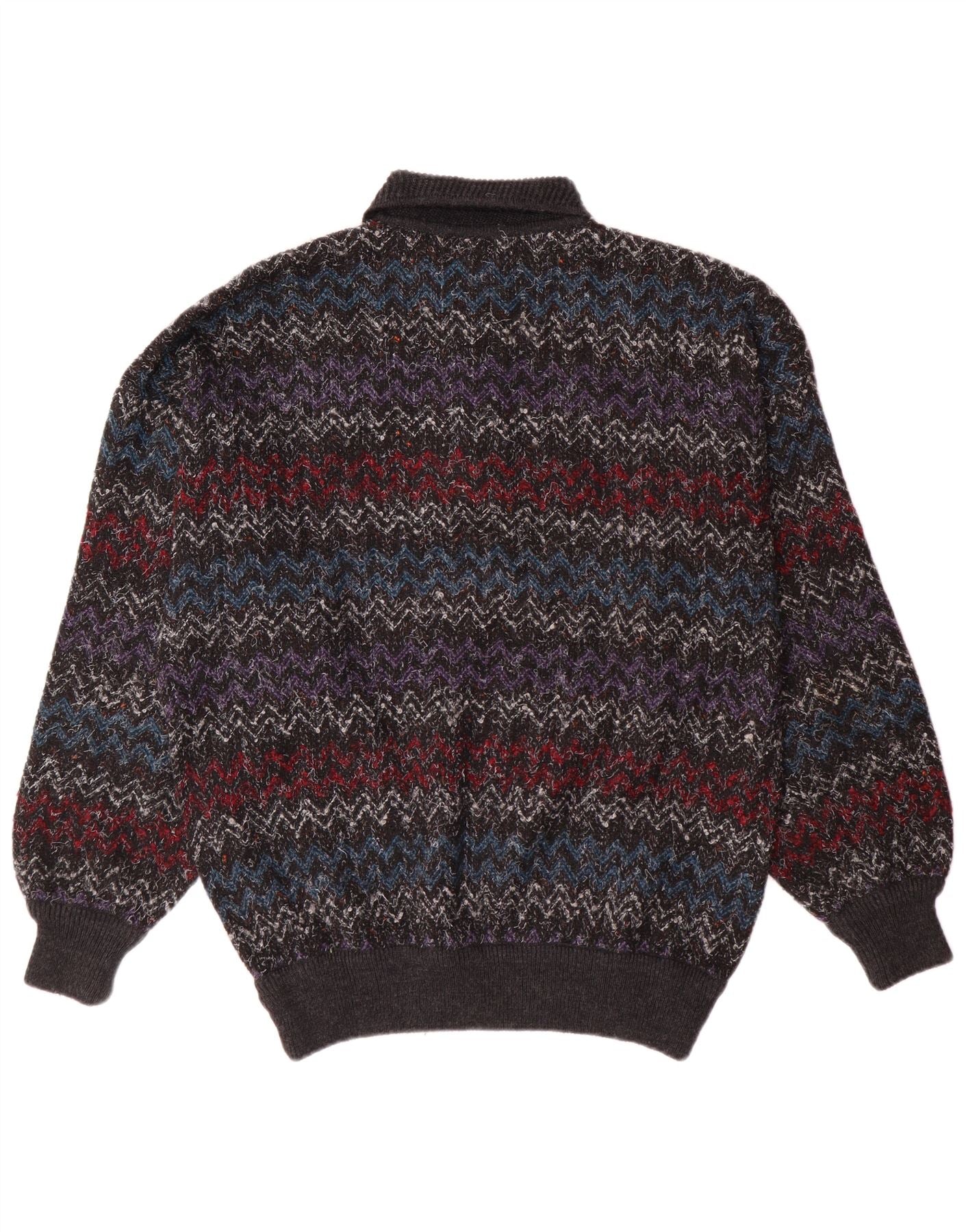 - AI Description: This Maglificio mens Polo Neck Jumper Sweater is crafted from a warm wool blend knit. It features a distinctive multicoloured chevron pattern in grey, black, purple, red, and blue tones. The collared neckline includes a button closure for versatile styling. Long sleeves and a regular fit ensure comfort and a classic silhouette. This retro-inspired piece offers both warmth and a unique visual appeal.
