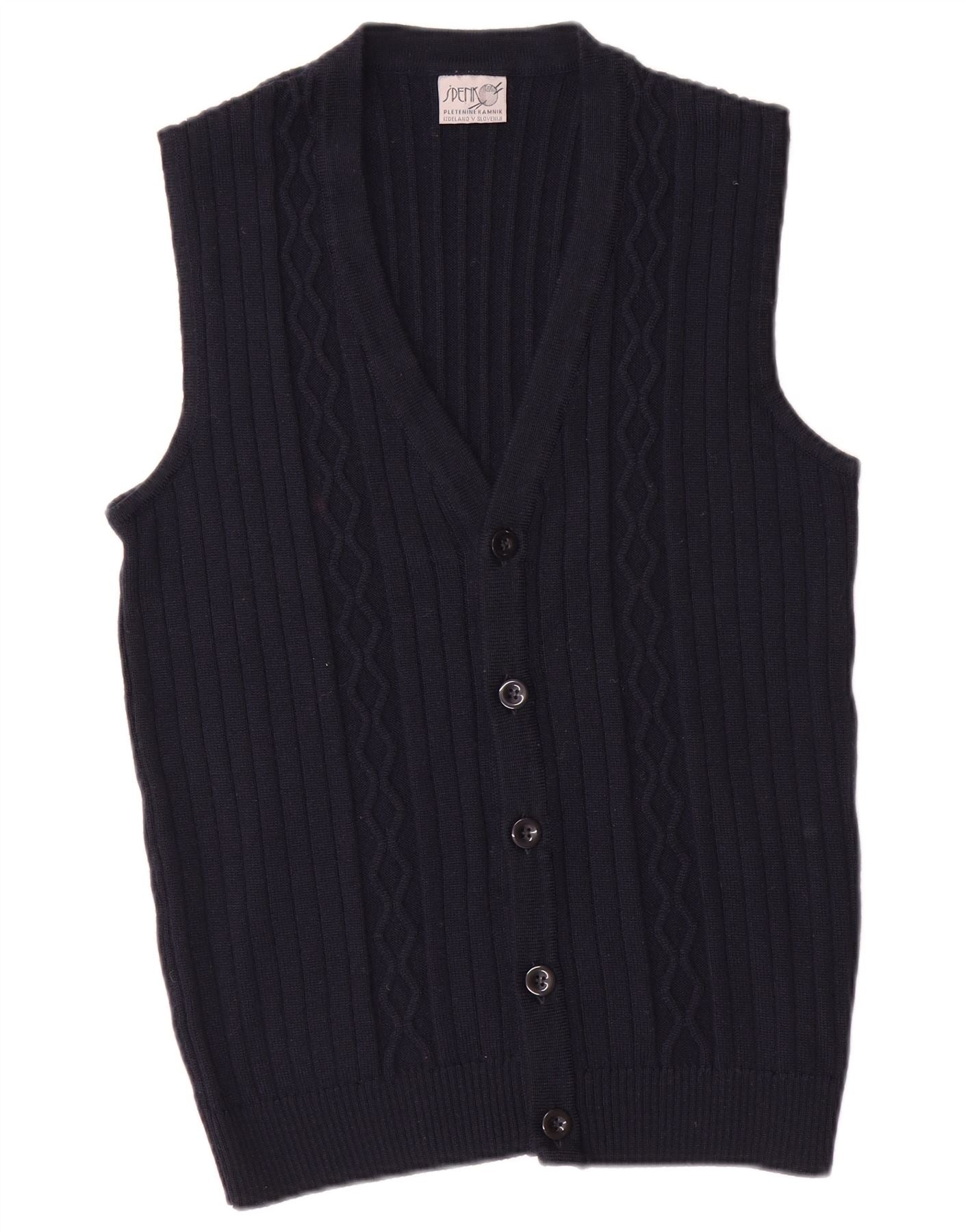 - AI Description: This Vintage womens waistcoat is crafted from soft navy blue acrylic knit, featuring a comfortable ribbed texture with subtle vertical detailing. It has a classic V-neckline and a sleeveless design. The regular fit ensures ease of wear. A five-button front closure with tonal buttons completes the traditional look. This piece offers timeless style and comfort.