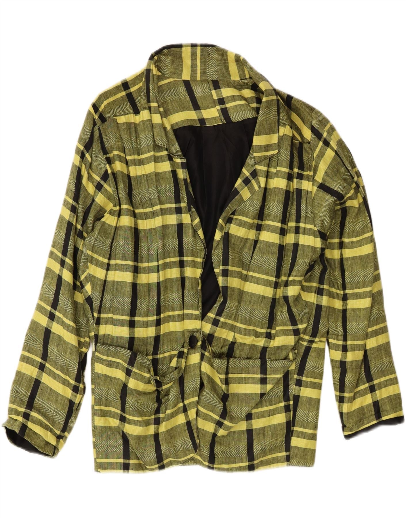 Vintage Womens 1 Button Blazer Jacket EU 44 XL Yellow Plaid Linen Classic