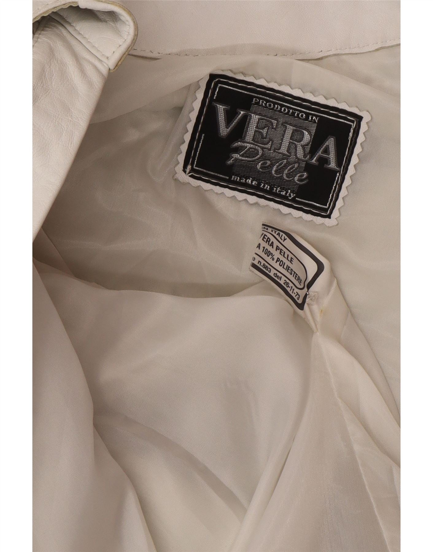 - AI Description: This Vintage womens leather jacket is crafted from soft off-white real leather, offering a luxurious feel. It features a classic collared neckline and a button-up front closure. Long sleeves provide full coverage. The regular fit ensures comfortable wear. Distinctive pleated detailing adorns the front and back panels, adding unique texture and visual interest. It is fully lined for added comfort and structure, and includes practical pockets.