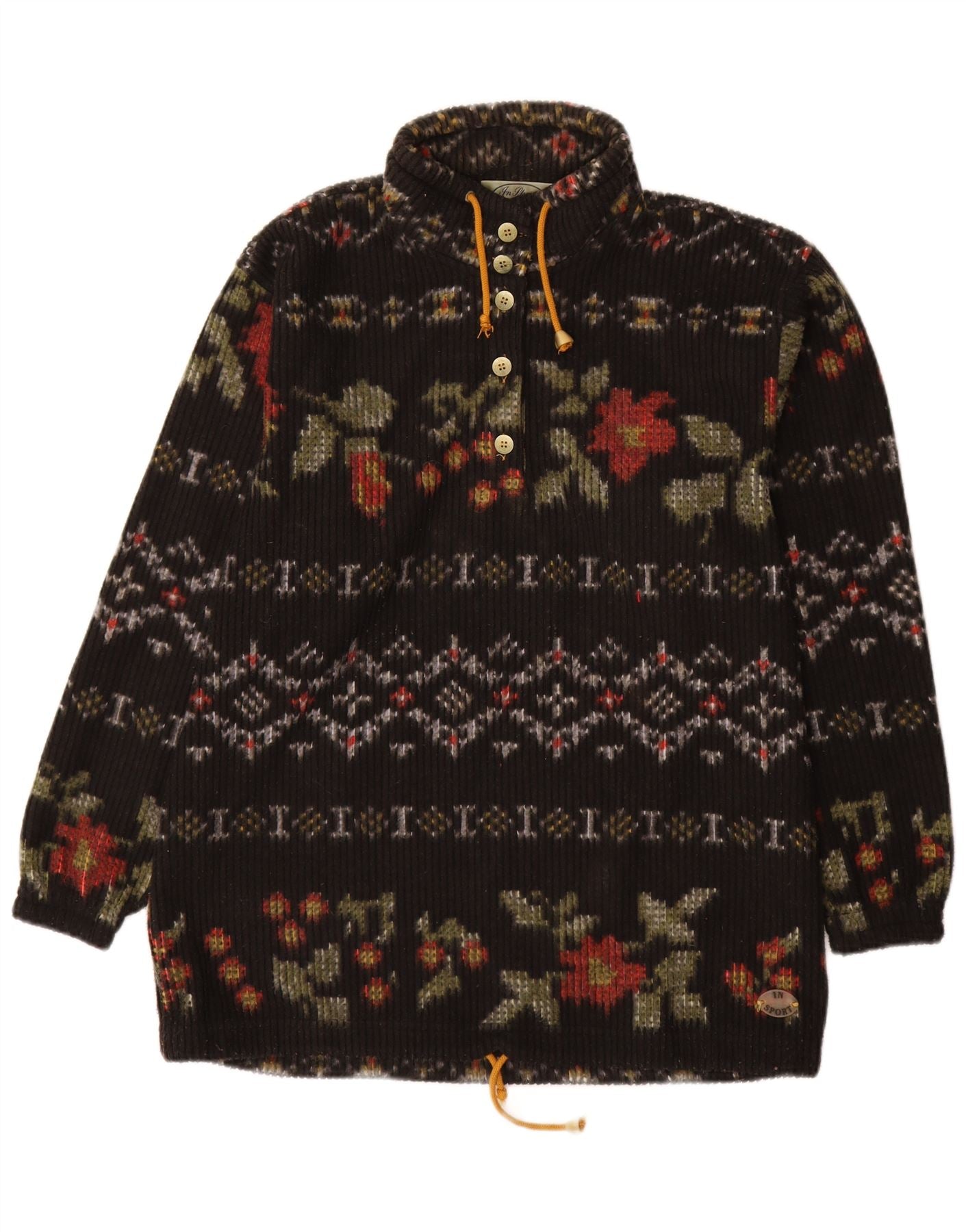 - AI Description: This In Sport womens fleece jacket is crafted from soft black fleece, offering warmth and comfort. It features a vibrant floral pattern in multicoloured hues, adding a distinctive retro style. The high neck and long sleeves provide ample coverage. A button-up front closure and adjustable drawstring hem enhance its practical design. The regular fit ensures comfortable wear for everyday adventures.