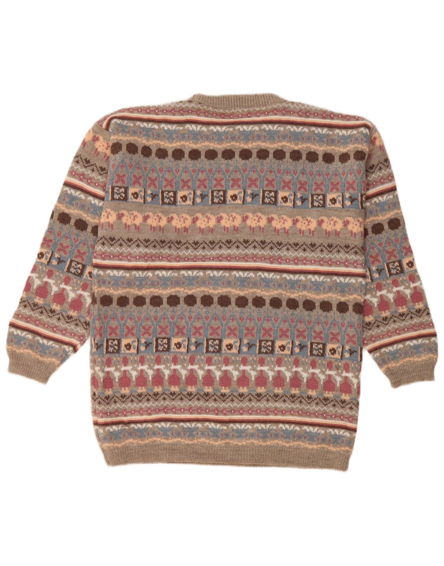 - AI Description: This Vintage womens sweater is crafted from a soft knit fabric. It features a classic Fair Isle pattern in a multicoloured beige, brown, and grey palette. The round neck and long sleeves offer a comfortable, traditional silhouette. Designed as a pullover, it has a regular fit for easy wear. This piece combines warmth with timeless style.
