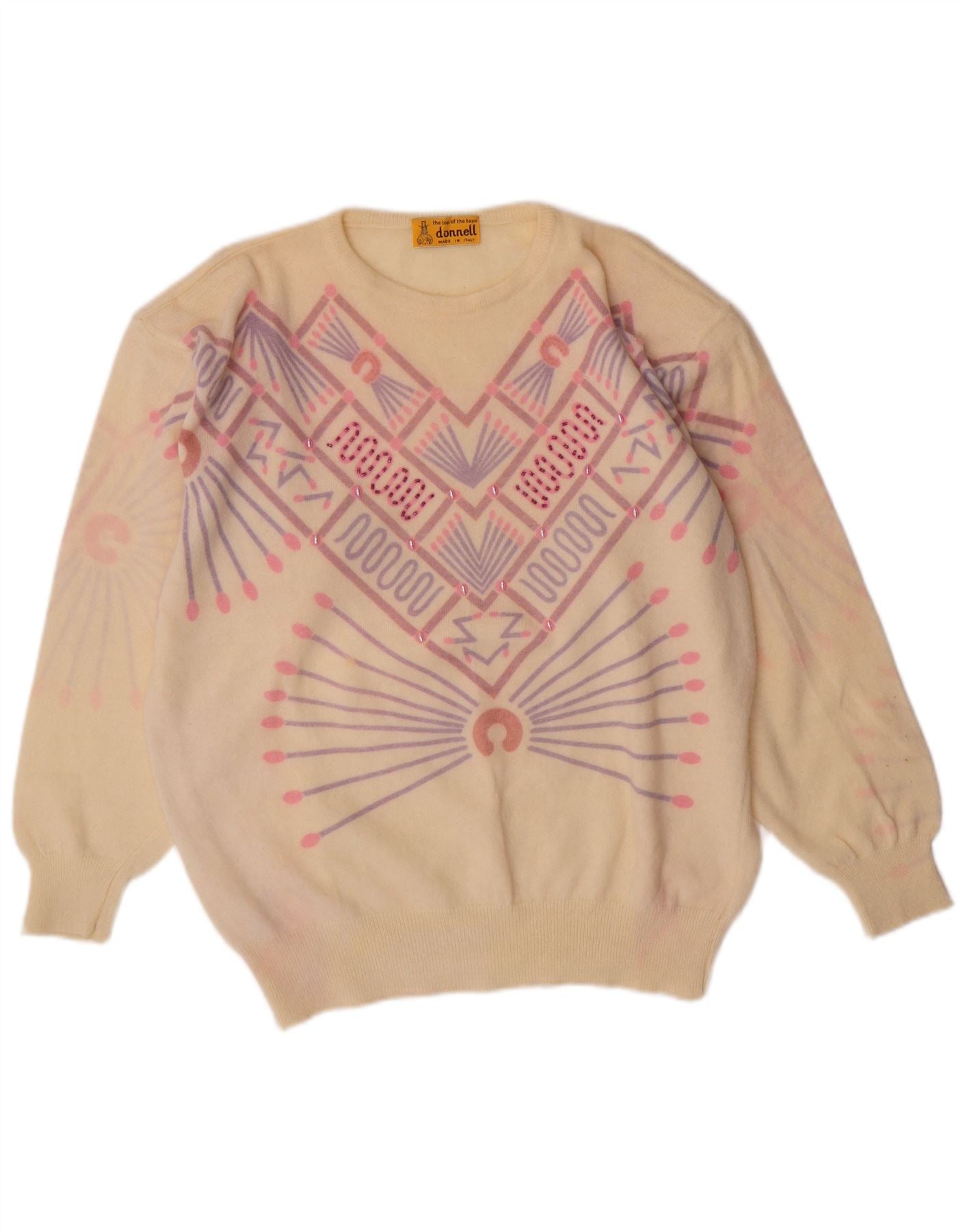 VINTAGE Womens Crew Neck Jumper Sweater UK 16 Large Off White Geometric