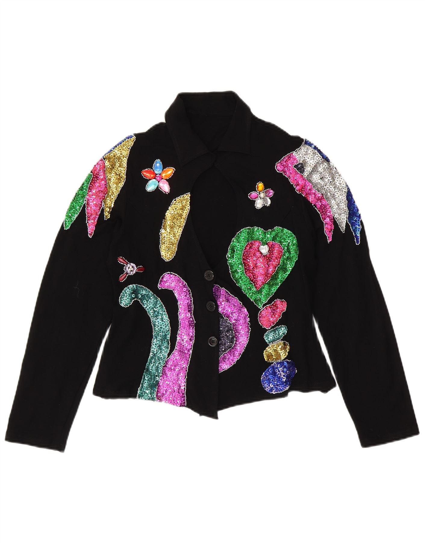 VINTAGE Womens Crop Shirt Blouse UK 12 Medium Black Floral Spandex