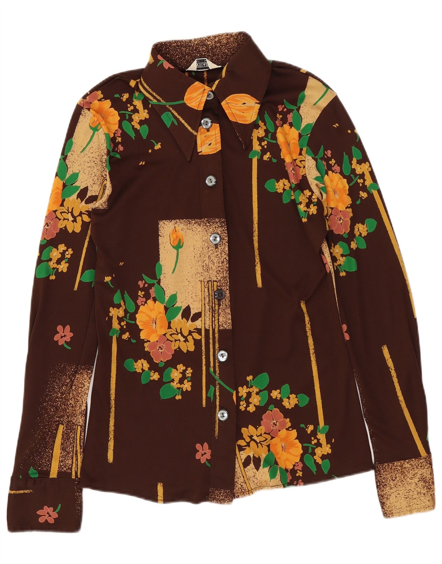 - AI Description: This Vintage Vicad womens shirt is crafted from a smooth blended fabric. It features a rich brown base with a vibrant floral pattern in orange, yellow, and green tones. The collared neckline and full button-up front provide classic structure. Long sleeves finish with neat cuffs. Its regular fit ensures a comfortable, timeless silhouette, perfect for a retro-inspired look.