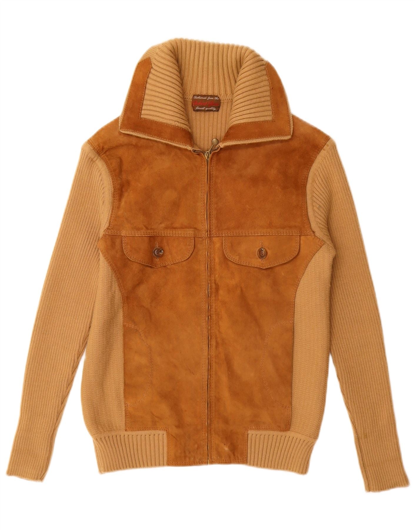 VINTAGE Womens Suede Cardigan Sweater UK 12 Medium Beige Colourblock