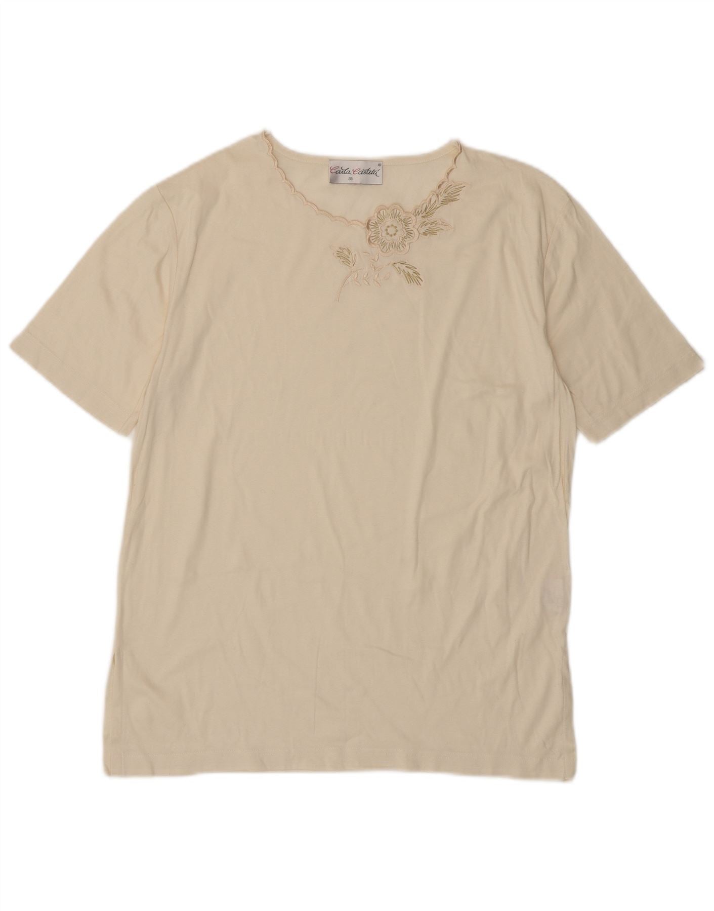 VINTAGE Womens T-Shirt Top EU 38 Medium Off White Floral Cotton