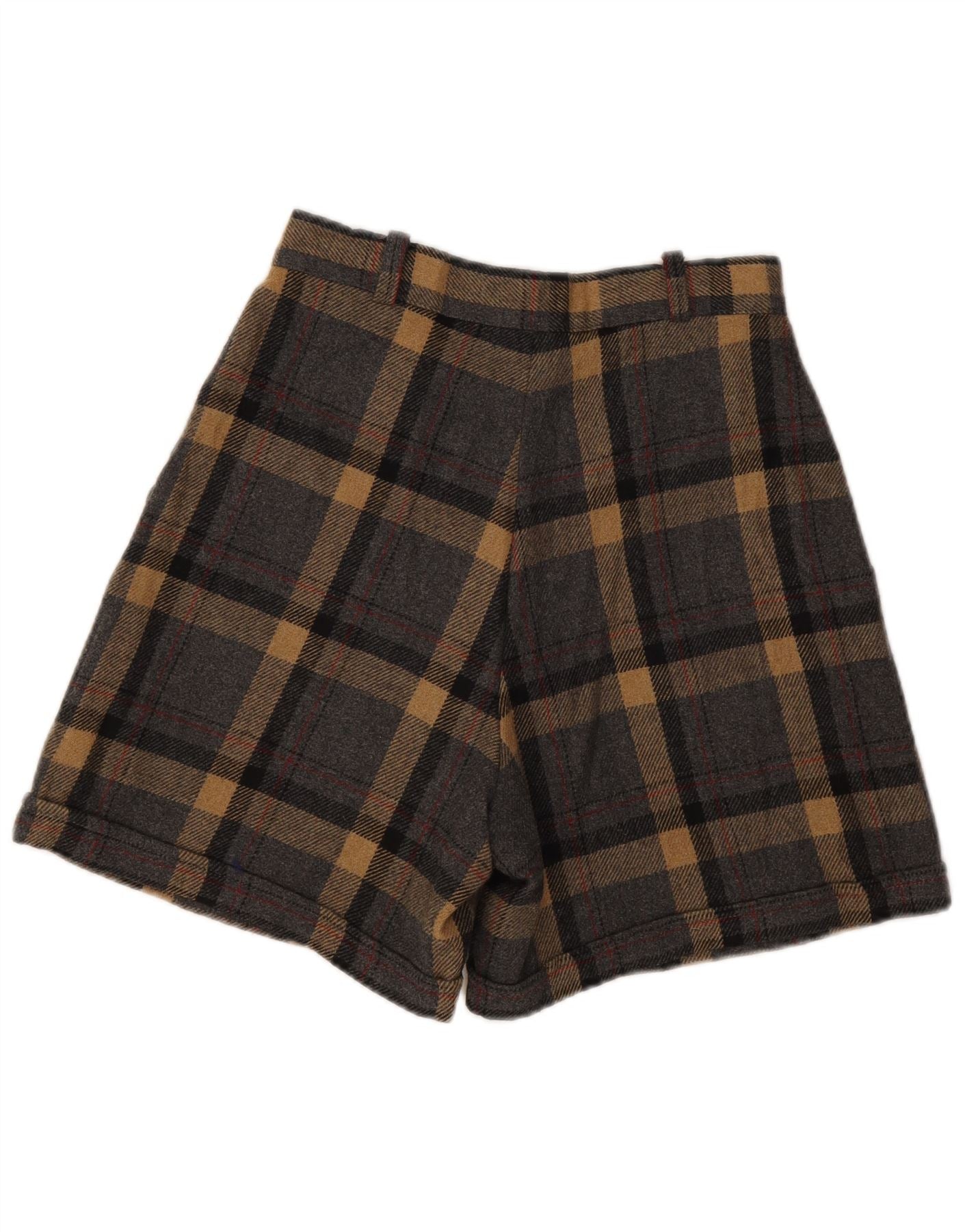 - AI Description: These Vintage women's shorts are crafted from a woven fabric, featuring a soft, textured feel. A classic grey plaid pattern is accented with warm beige, black, and subtle red lines. They feature a regular fit with a button closure for a secure waist. The design includes practical pockets and a tailored structure. These classic shorts offer a timeless, smart casual aesthetic.