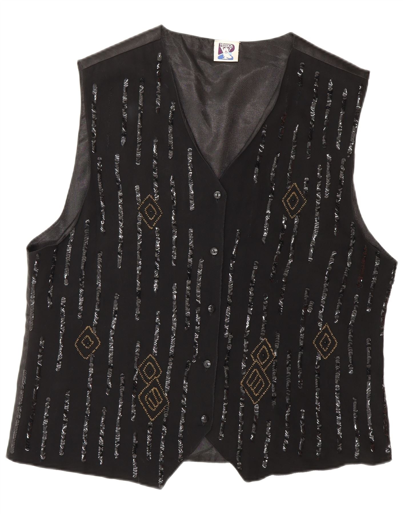 - AI Description: This Yessica womens waistcoat is crafted from black viscose, offering a smooth, refined feel. It features a classic V-neckline and a sleeveless cut. The button-up front ensures a neat, regular fit. Geometric sequin detailing creates a striking pattern across the front. These sequins provide a subtle see through effect and elegant shimmer, adding a touch of classic style.