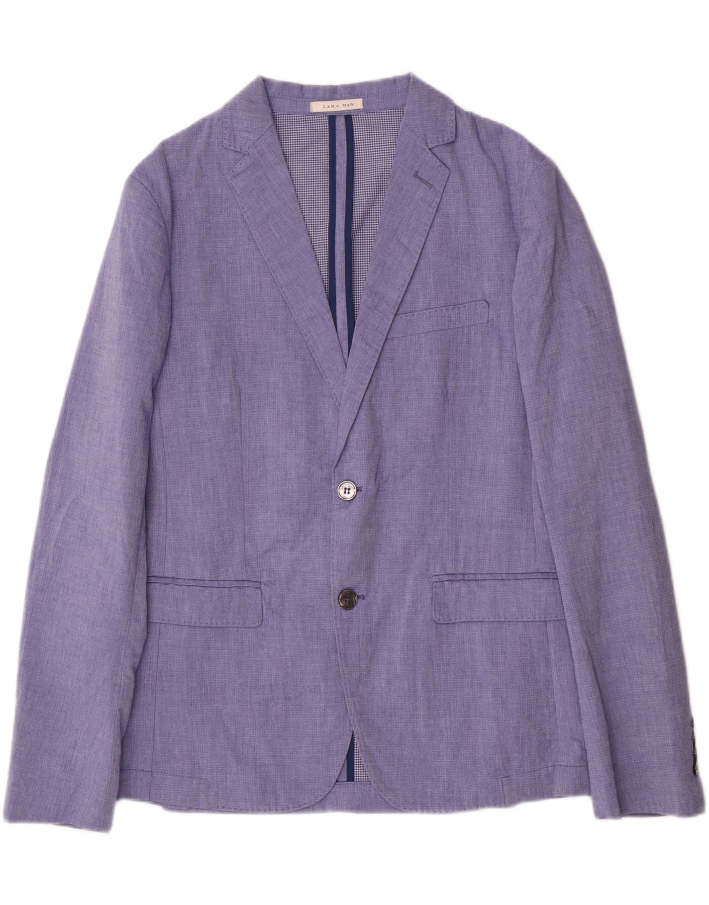 - AI Description: This Zara mens blazer is crafted from a lightweight blue cotton blend fabric. It features a classic collared neckline and a two-button front closure. Long sleeves and a regular fit ensure comfortable wear. The blazer includes practical pockets and is fully lined for a smooth finish. This versatile piece offers a smart, classic style suitable for various occasions.
