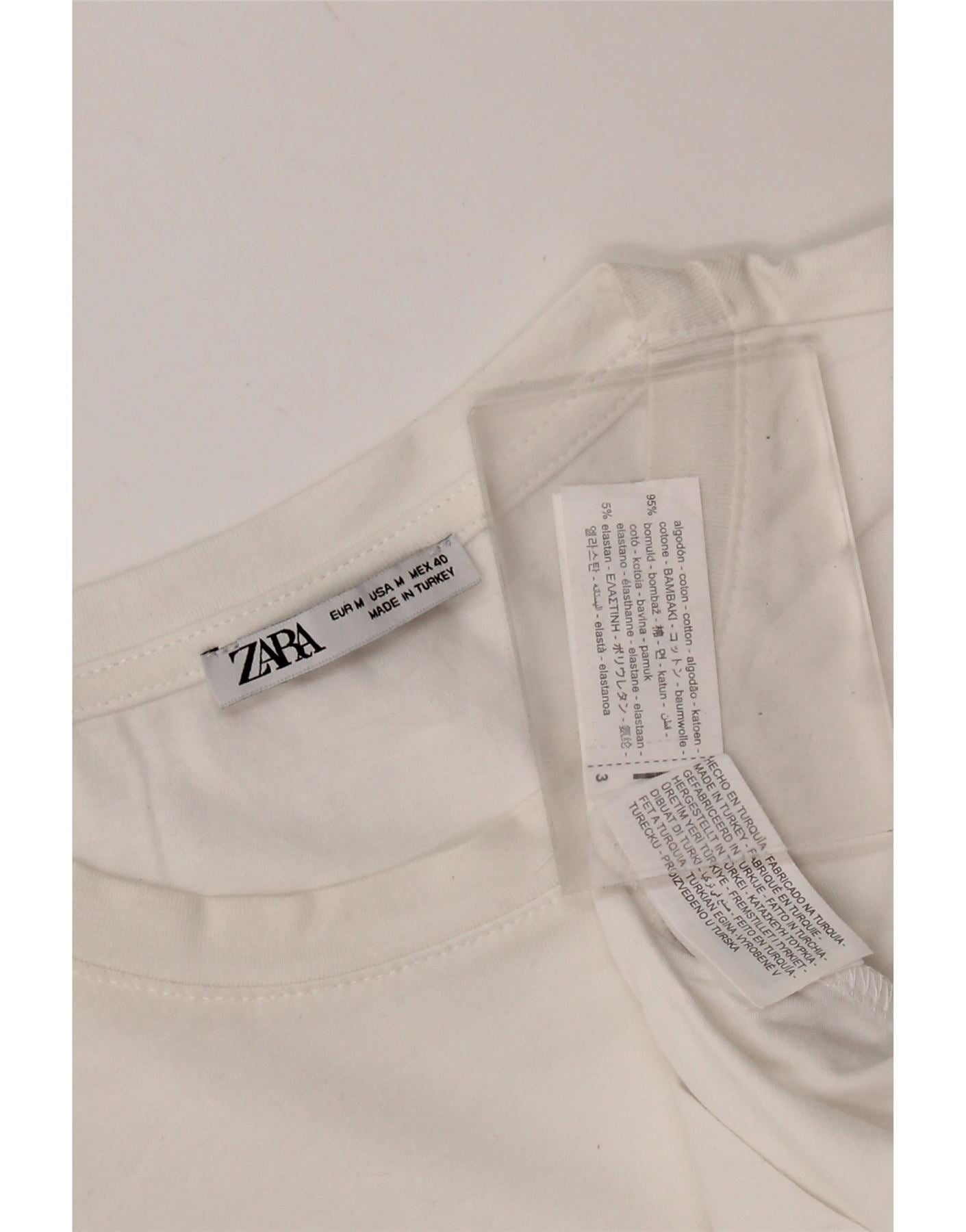 - AI Description: This Zara mens long-sleeve T-shirt is crafted from a soft white cotton jersey blend. The fabric includes elastane for comfortable stretch. It features a classic round neck and long sleeves, offering versatile coverage. The pullover style ensures ease of wear. A regular fit provides a comfortable and timeless silhouette. This classic piece is perfect for layering or wearing on its own.